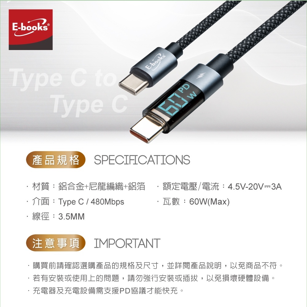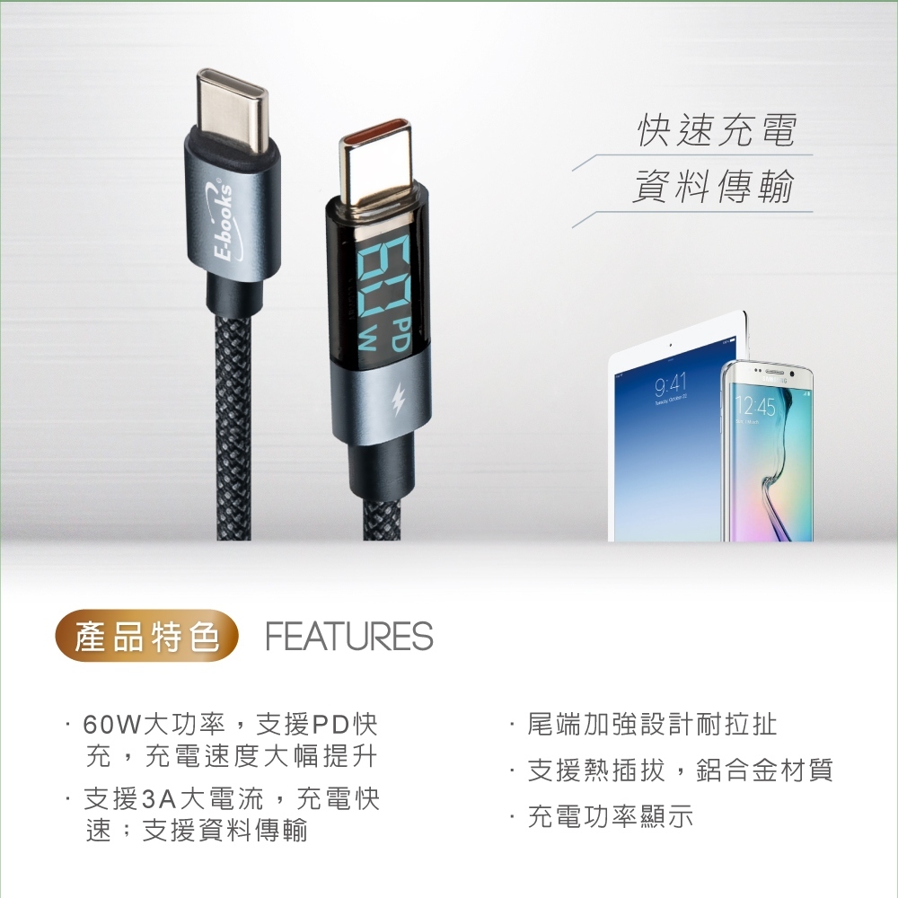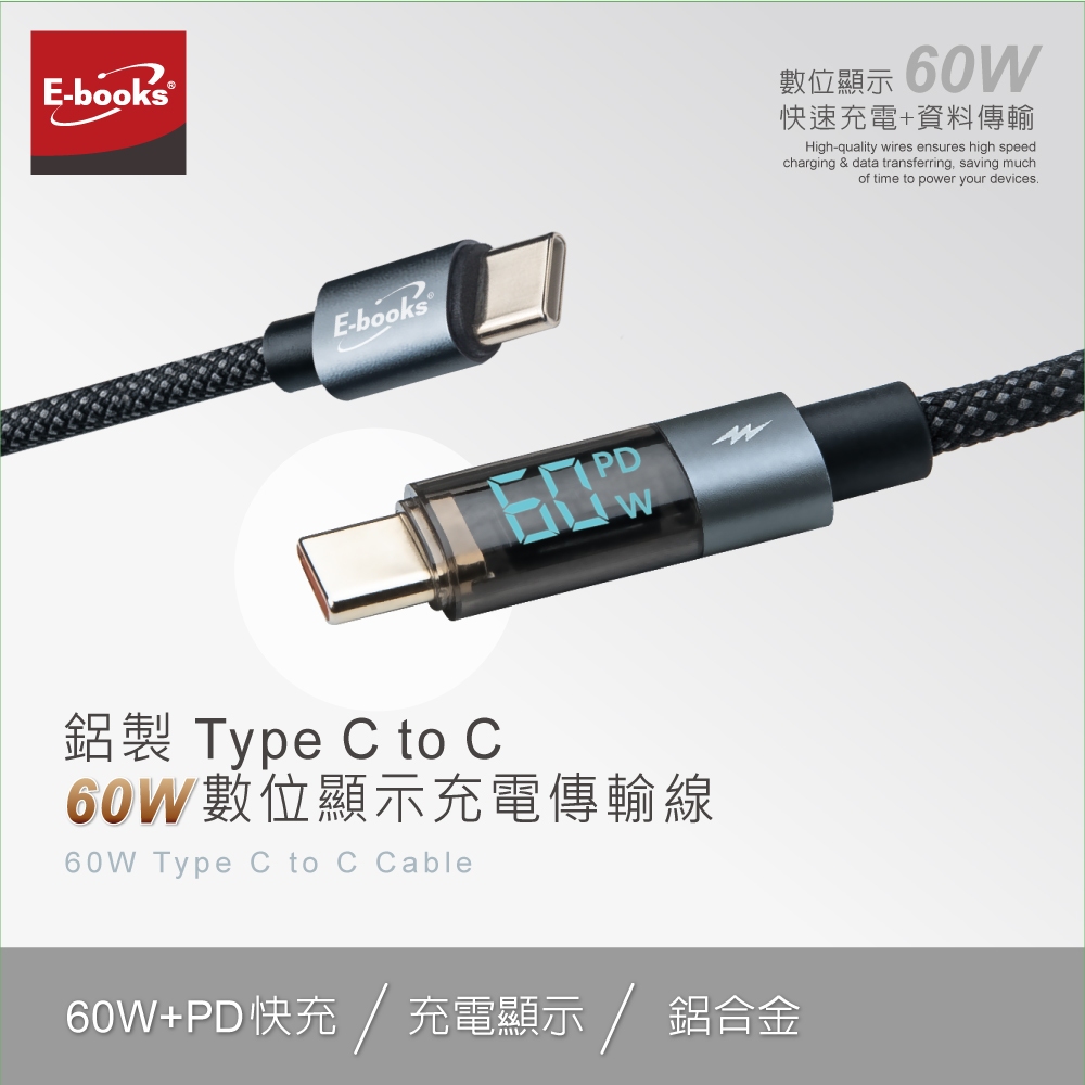 E-books XA52 鋁製 Type C to C 60W數位顯示充電傳輸線-1ME-books XA52 鋁製 Type C to C 60W數位顯示充電傳輸線-1MCables, Chargers & ConvertersE-books 官方旗艦店