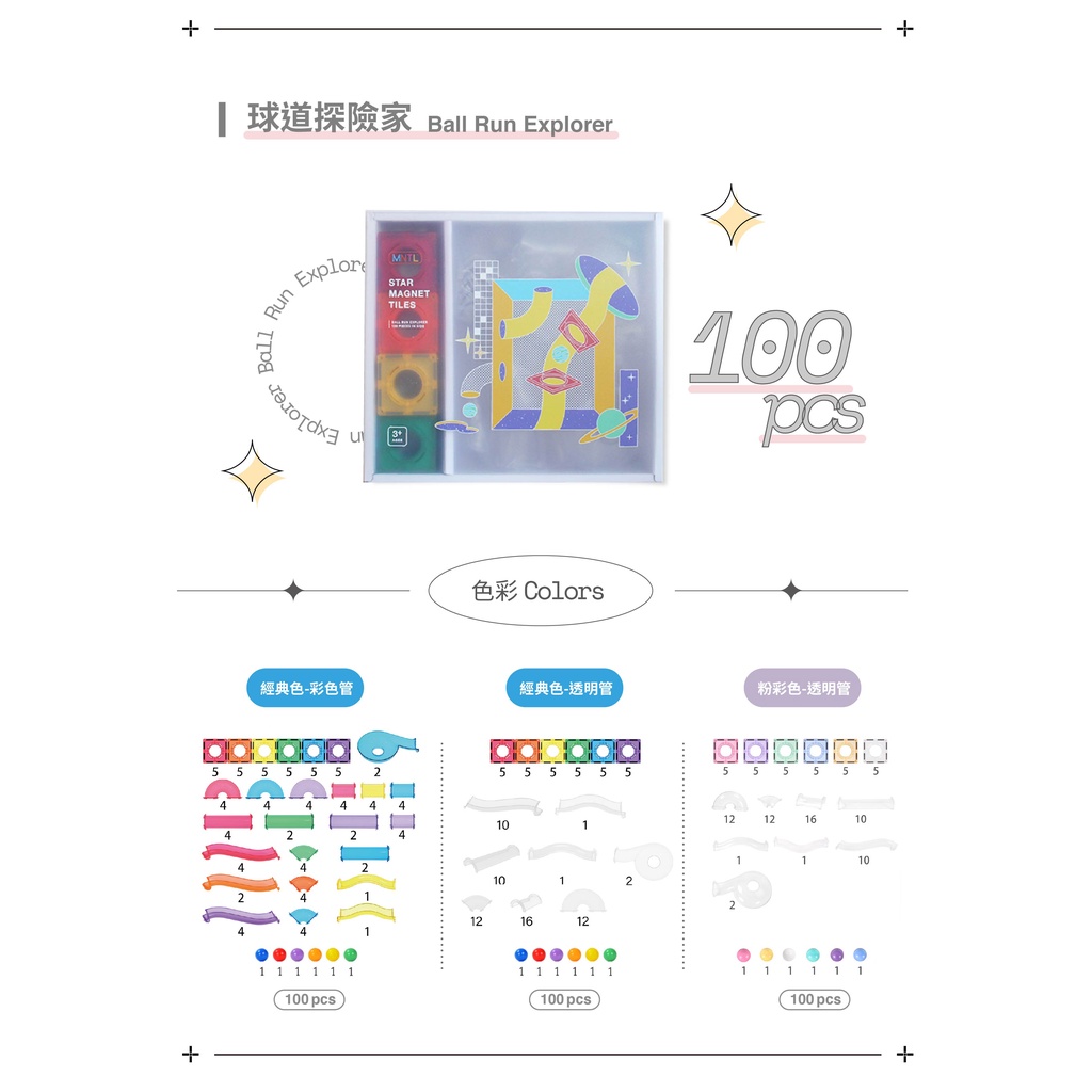 MNTL 磁力片球道探險家組合 Ball Run 100pcs 多款可選【CHOCHO親子選物】經典透明|粉彩透明|經典彩管Educational ToysCHOCHO親子選物