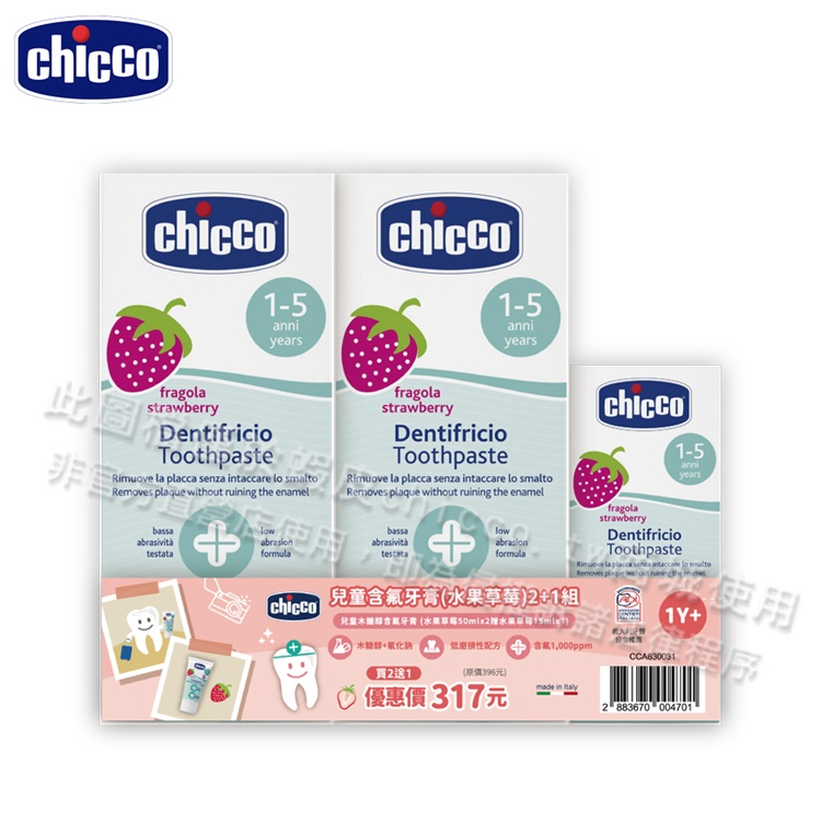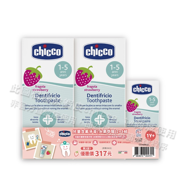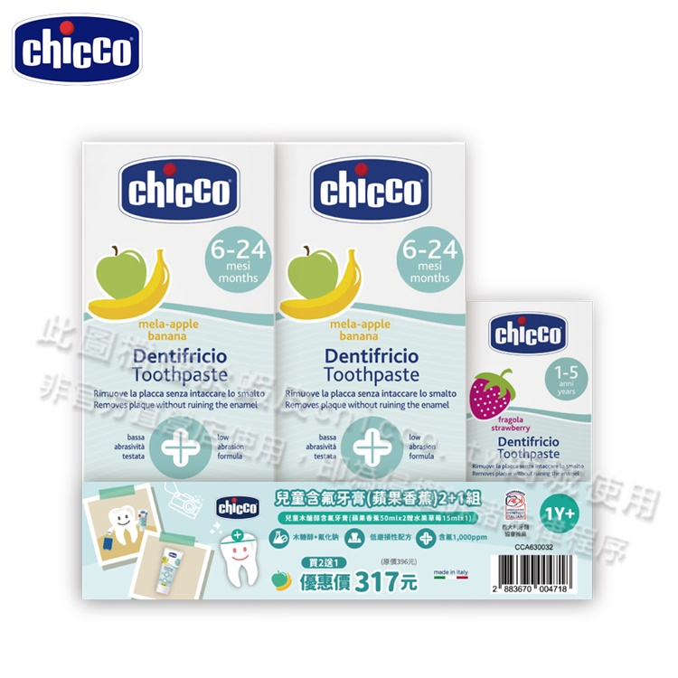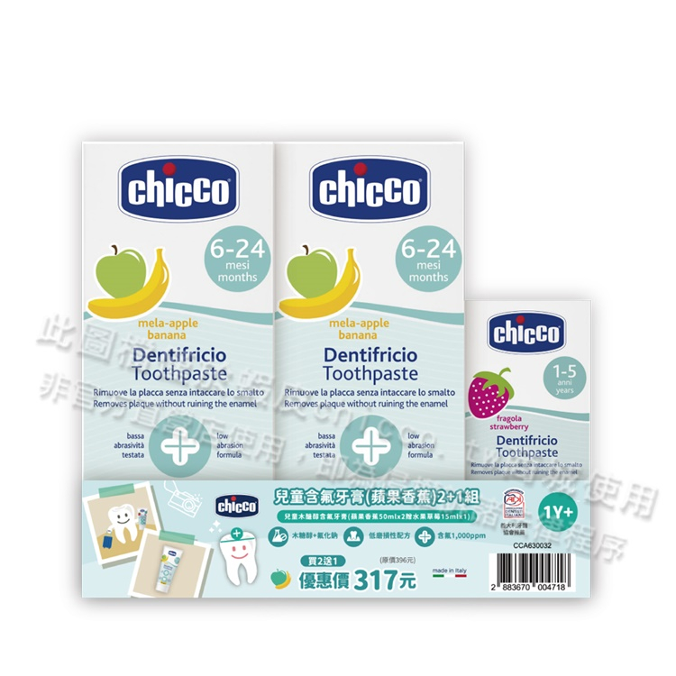 chicco-兒童含氟牙膏2+1組牙膏(50ml-2入+15ml-1入) 幼童潔牙 刷牙草莓50ml-2入+草莓15ml-1入|香蕉50ml-2入+草莓15ml-1入Baby Oral Carechicco官方直營-義大利嬰幼館