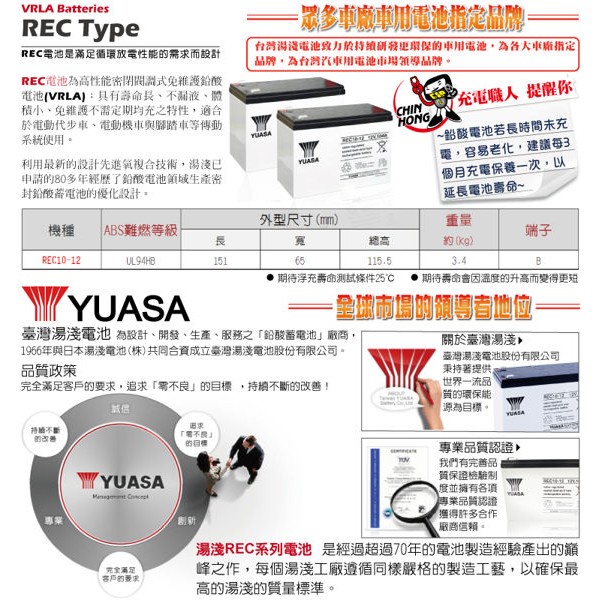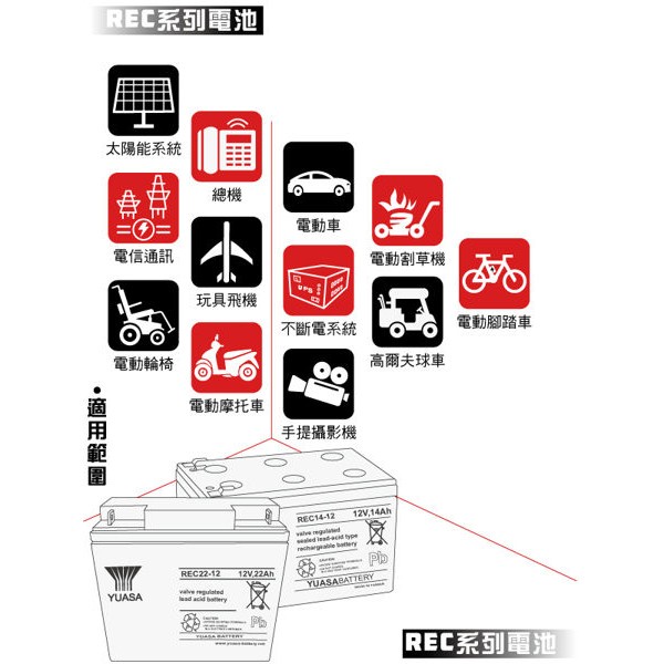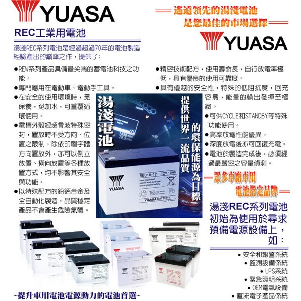 【YUASA】REC10-12 鉛酸電池12V10Ah 電動車電池 釣魚電池 捲線器 UPS 緊急照明裝置 電動工REC10-12|REC10-12買2顆以上 請用宅配Batteries & AccessoriesCSP進煌 藍騎士 電池電瓶充電器 電瓶檢測器 膠體電池 太陽能電池