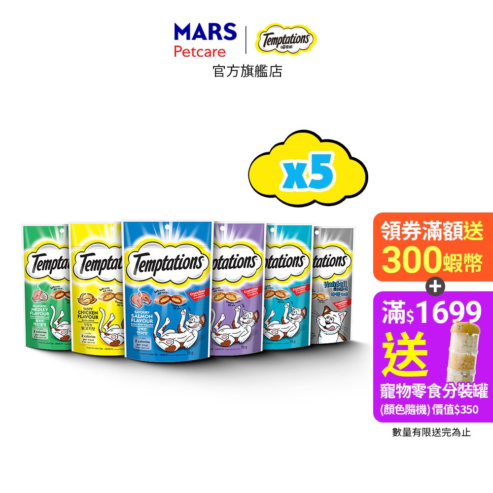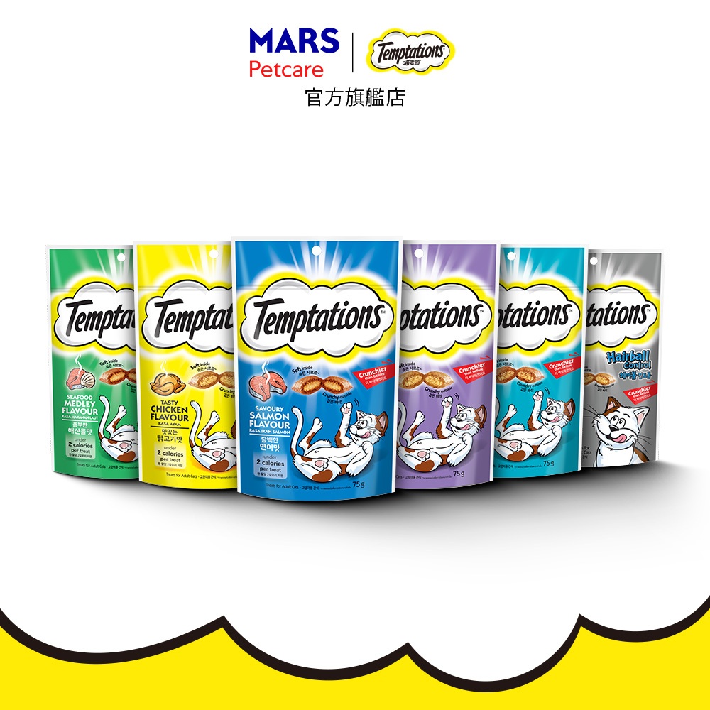 【Temptations喵愛餡】 貓餅乾點心 5入 (75g/60g/包) 多口味 寵物 貓零食/貓點心香誘鮮鮪75gx5包|火烤嫩雞75gx5包|海鮮百匯75gx5包|開胃甜鮭75gx5包|香濃牛奶75gx5包|化毛配方75gx5包|貓薄荷、嫩雞及起司 75gx5包Cat TreatsCesar西莎 官方旗艦店 寵物食品 | 健綠 | SHEBA | 寶路