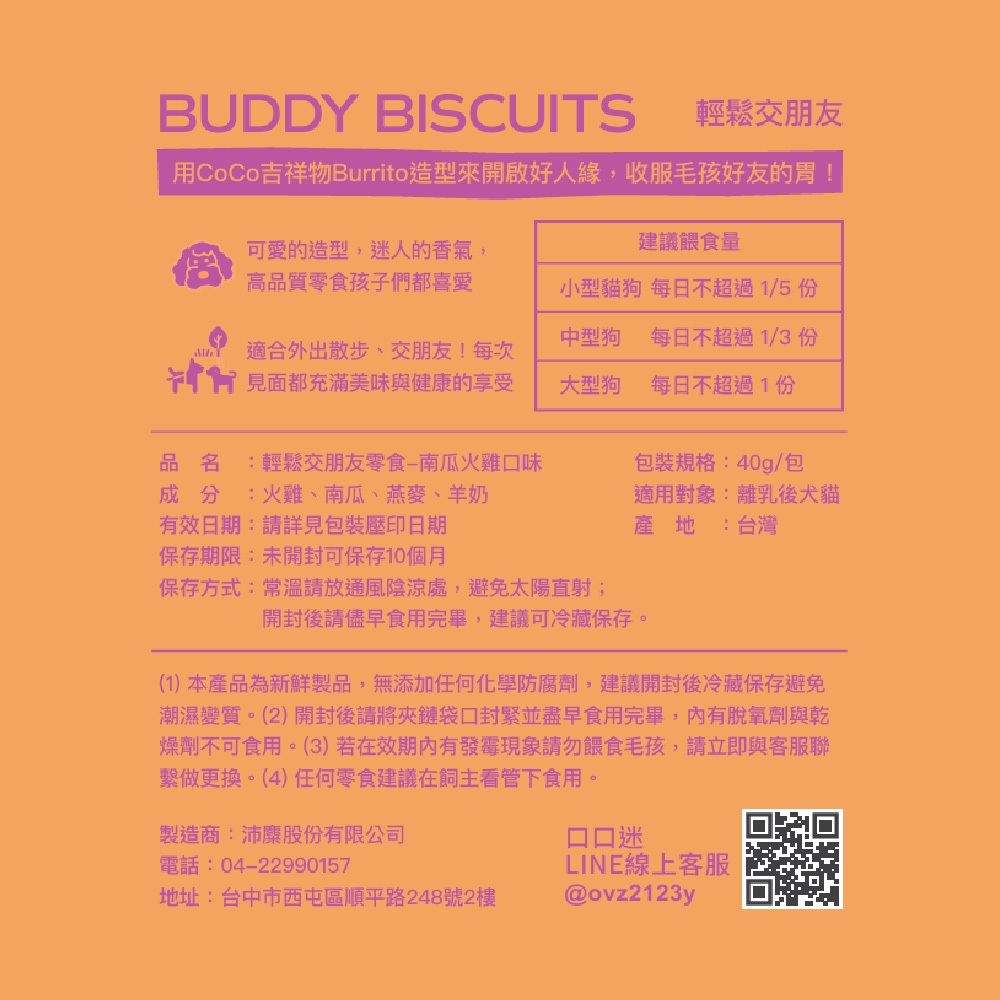 輕鬆交朋友零食【南瓜火雞】交友零食 BUDDY BISCUITS 40g/包輕鬆交朋友零食【南瓜火雞】交友零食 BUDDY BISCUITS 40g/包Dog TreatsCOCONILLA 口口迷 寵物鮮食 官方直營