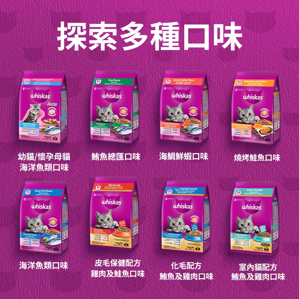 【Whiskas偉嘉】貓乾糧 單入 (1.1kg/1.2kg/袋) 小包裝 多口味 寵物 貓飼料/貓主食幼貓/懷孕母貓1.1kg,1包|皮毛保健 雞肉及鮭魚,1包|鮪魚總匯1.2kg,1包|海鯛鮮蝦1.2kg,1包|燒烤鮭魚1.2kg,1包|海洋魚類1.2kg,1包|化毛配方 鮪魚雞肉1.1kg,1包|室內貓-鮪魚雞肉1.1kg,1包Cat FoodCesar西莎 官方旗艦店 寵物食品 | 健綠 | SHEBA | 寶路