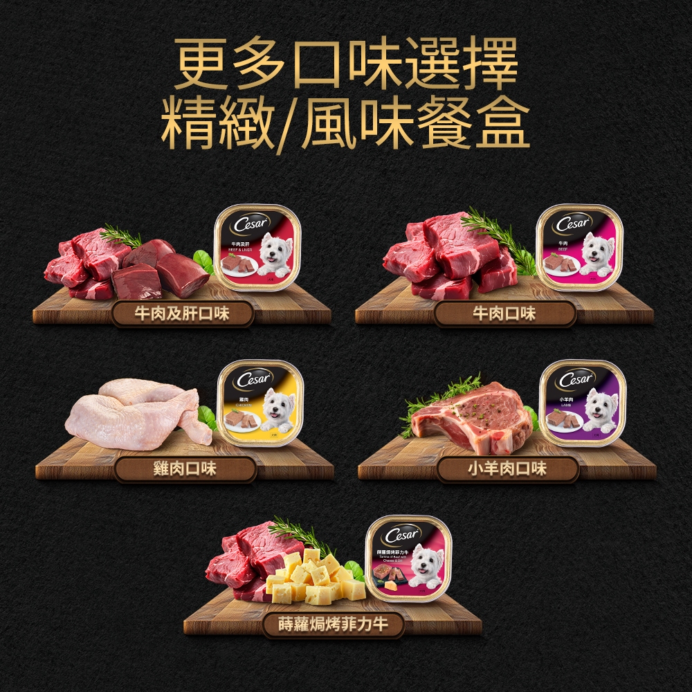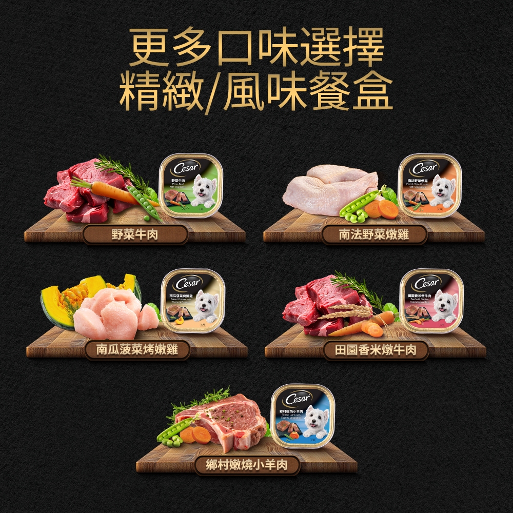 【Cesar西莎】風味餐盒 6入 (100g/盒) 多口味 寵物 狗罐頭/濕糧 【集點換購賣場】南法野菜燉雞|羊肉|野菜牛肉|雞肉|田園香米燉牛肉|牛肉及肝|南瓜菠菜烤嫩雞|牛肉|鄉村嫩燒小羊肉|蒔蘿焗烤菲力牛|綜合(牛+牛肝+雞肉+菲力牛+燒羊+野牛Dog FoodCesar西莎 官方旗艦店 寵物食品 | 健綠 | SHEBA | 寶路