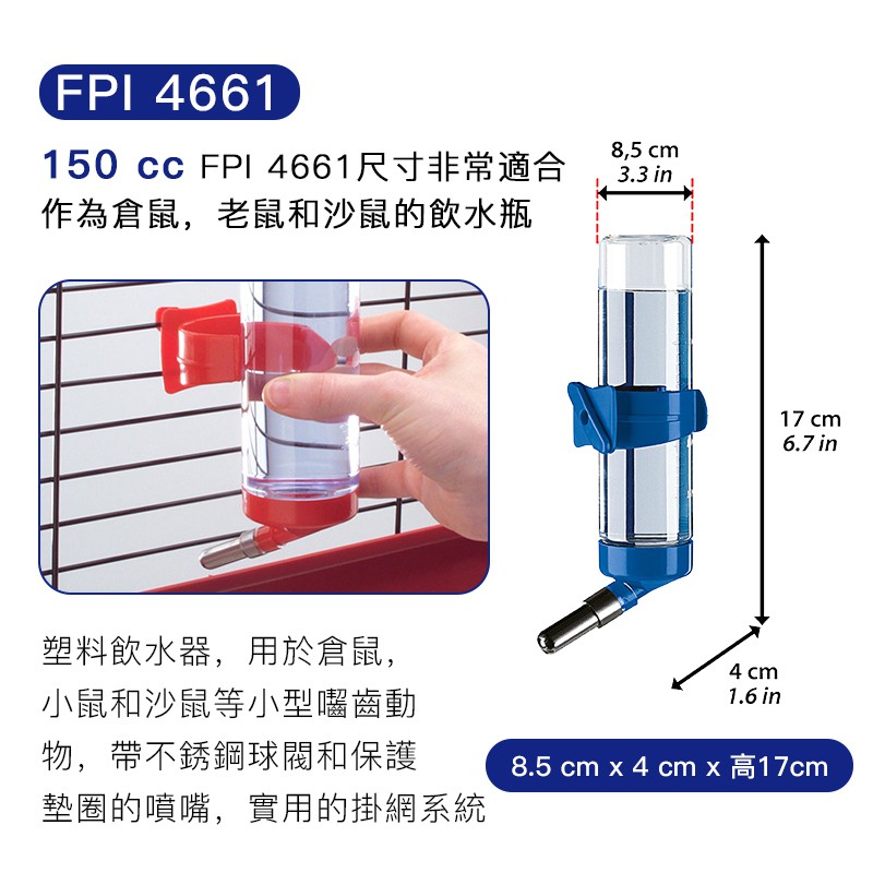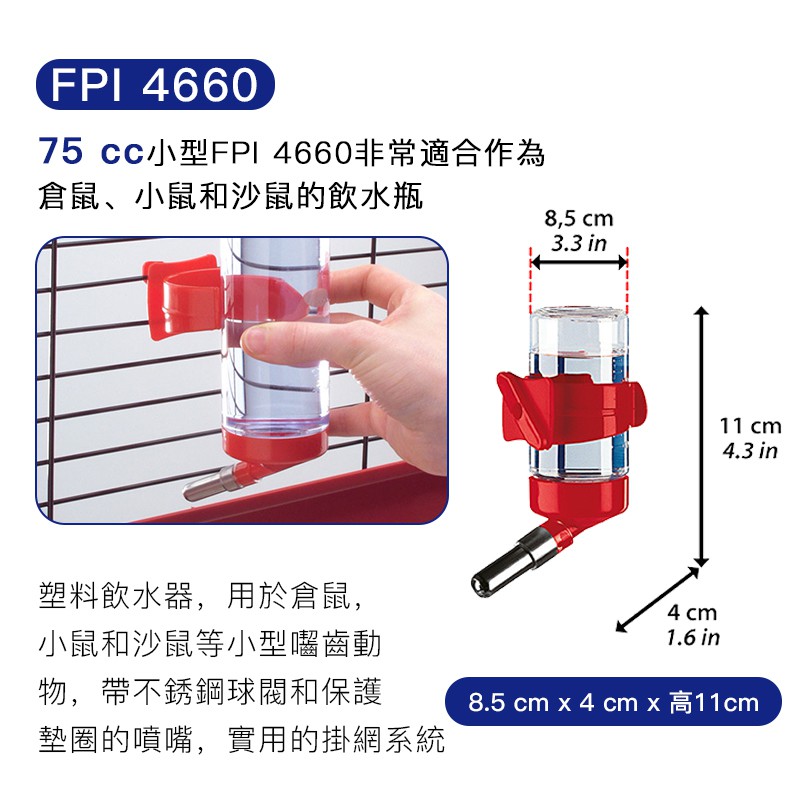 《義大利飛寶ferplast》網架滾珠飲水器 / 倉鼠日常用品FPI 4462(300ml)灰|FPI 4462(300ml)紅|FPI 4463(600ml)紅|FPI 4461(150ml)灰|FPI 4461(150ml)藍|FPI 4461(150ml)紅|FPI 4462(300ml)藍|FPI 4463(600ml)灰|FPI 4460(75ml)灰|FPI 4460(75ml)藍|FPI 4460(75ml)紅|FPI 4463(600ml)藍|吸盤固定式飲水器架|FPI 4463(600ml)綠Small Pet FoodFerplast飛寶品牌旗艦店