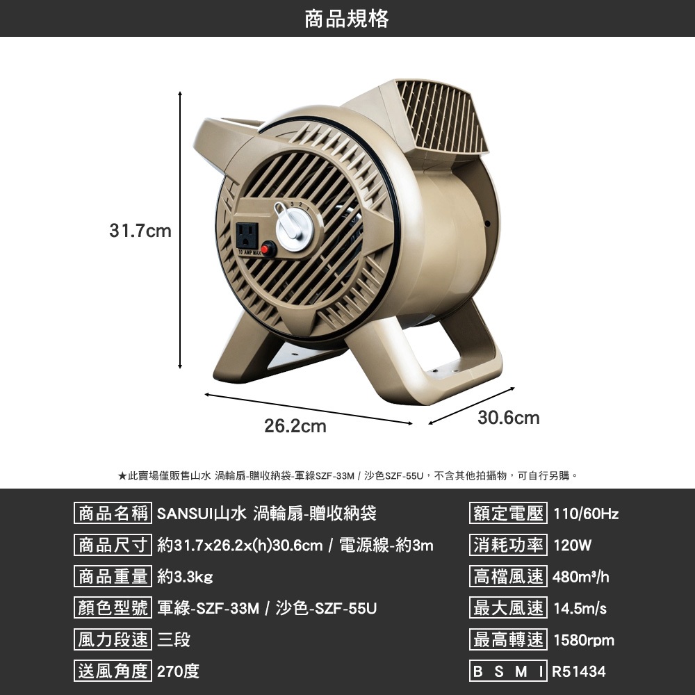SANSUI 山水 渦輪扇 內附收納袋 軍綠SZF-33M 沙色SZF-55U 風扇 電扇 露營SZF-33M(軍綠)內附收納袋|SZF-55U(沙色)內附收納袋Camping & HikingCAMP WORLD 逐露 天下 露營 登山 生活 商城旗艦店