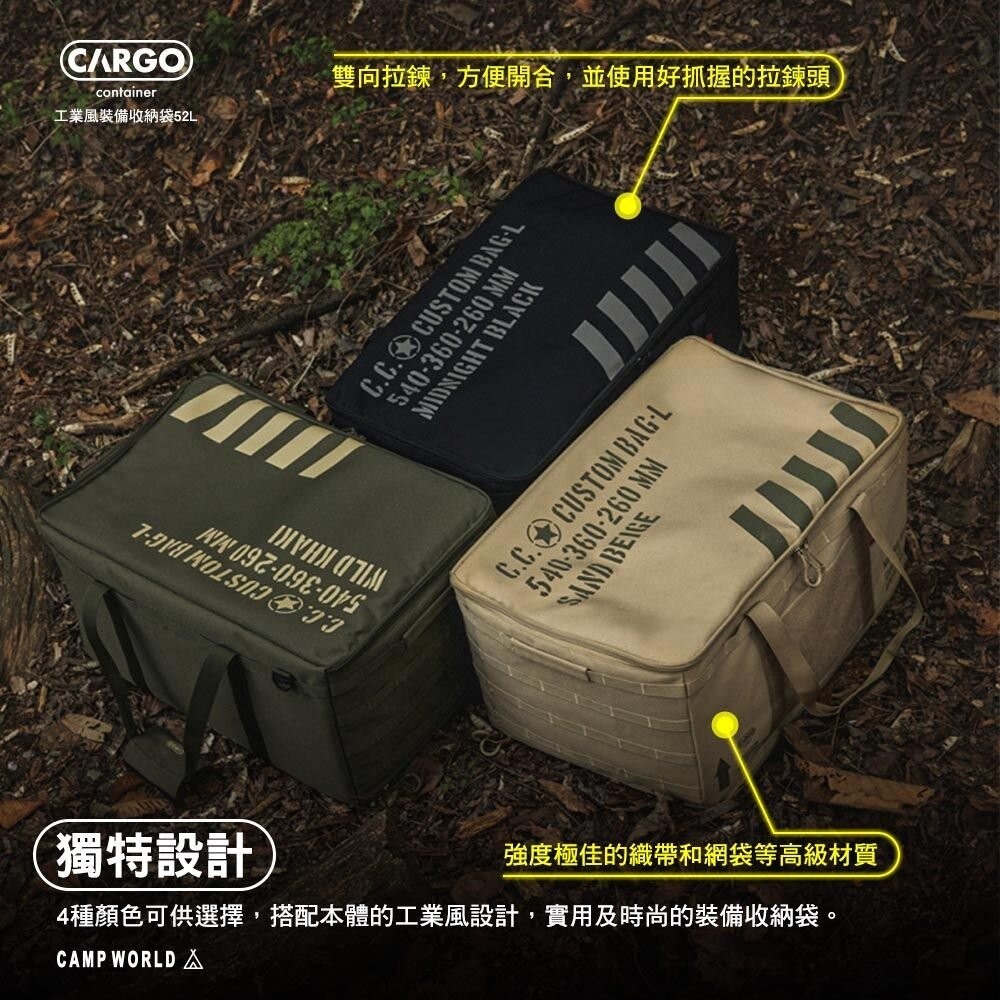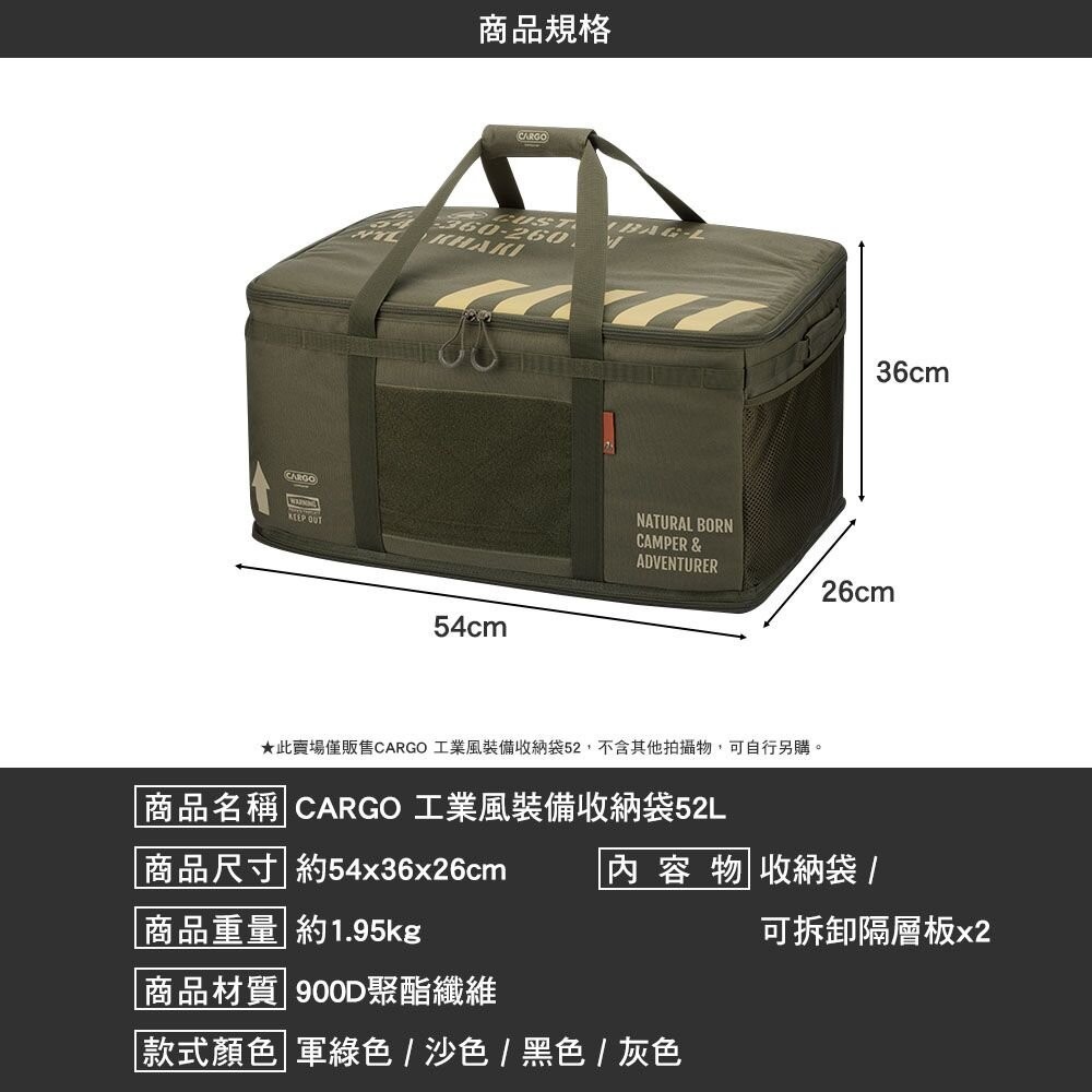 CARGO 工業風裝備收納袋52L 裝備收納袋 工具袋 瓦斯袋 裝備包 露營逐露天下工業風裝備收納袋52L-黑色|工業風裝備收納袋52L-軍綠|工業風裝備收納袋52L-沙色|工業風裝備收納袋52L(灰色)Camping & HikingCAMP WORLD 逐露 天下 露營 登山 生活 商城旗艦店
