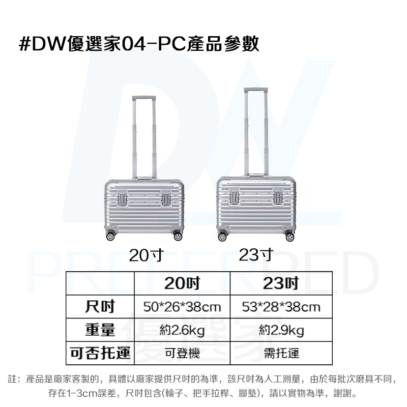台灣現貨+免運 20吋行李箱 超輕行李箱 機長箱 德國拜耳PC行李箱 化妝箱 拉桿箱 工具箱 鋁框行李箱 空姐行李箱👍商務神器鋁框箱-曜石黑,20吋【高配置,純PC箱體】|👍商務神器鋁框箱-曜石黑,23吋【高配置,純PC箱體】|👍商務神器鋁框箱-奢華銀,20吋【高配置,純PC箱體】|👍商務神器鋁框箱-奢華銀,23吋【高配置,純PC箱體】|👍商務神器鋁框箱-香檳金,20吋【高配置,純PC箱體】|👍商務神器鋁框箱-香檳金,23吋【高配置,純PC箱體】|👍商務神器鋁框箱-松石綠,20吋【高配置,純PC箱體】|👍商務神器鋁框箱-松石綠,23吋【高配置,純PC箱體】DW優選家™️
