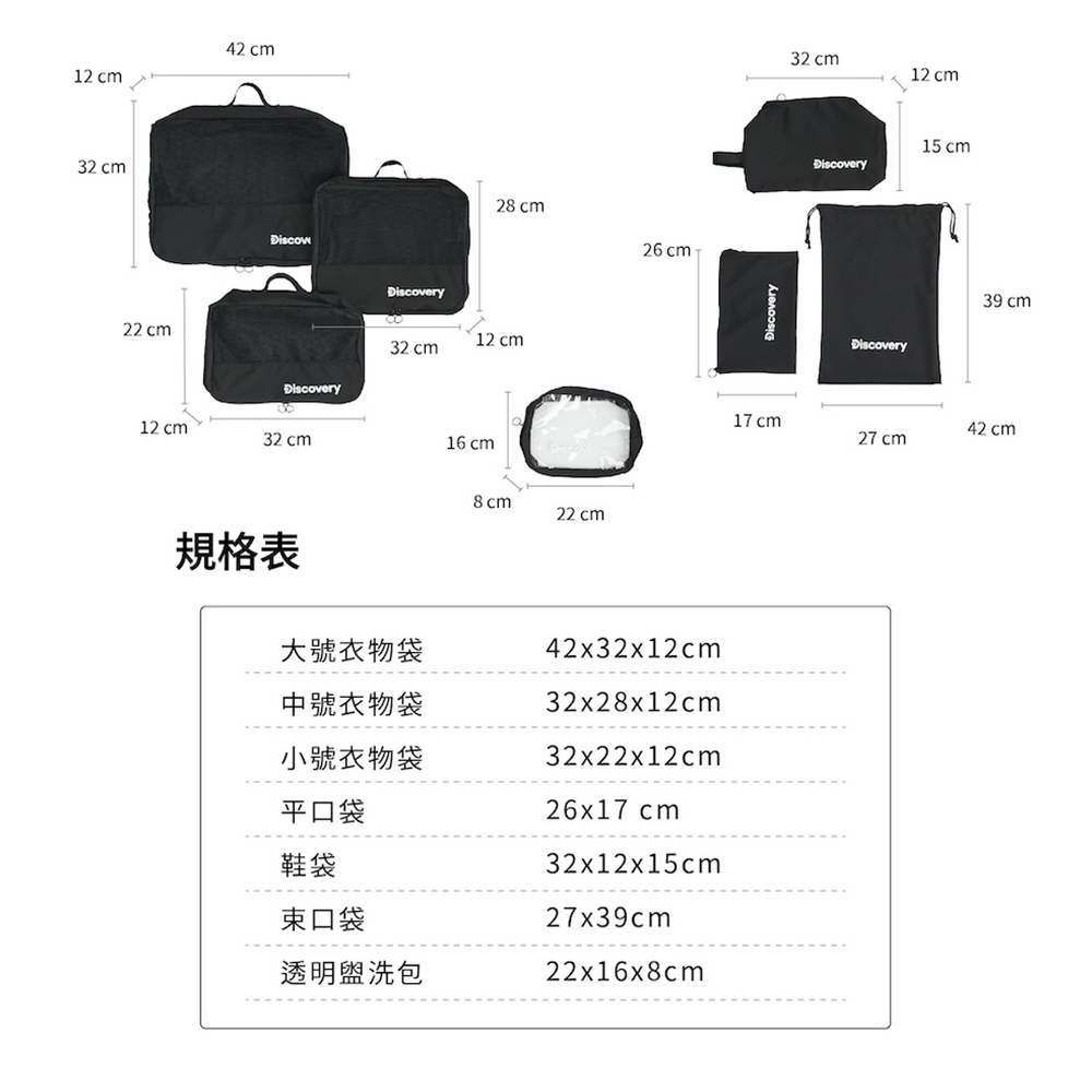【Discovery】旅行用收納七件組-黑 旅行袋 旅行收納包 衣物收納 收納包 盥洗包 行李收納袋 旅行分裝袋 鞋袋【Discovery】旅行用收納七件組-黑 旅行袋 旅行收納包 衣物收納 收納包 盥洗包 行李收納袋 旅行分裝袋 鞋袋Travel OrganizersDiscovery Adventures 探索旗艦店