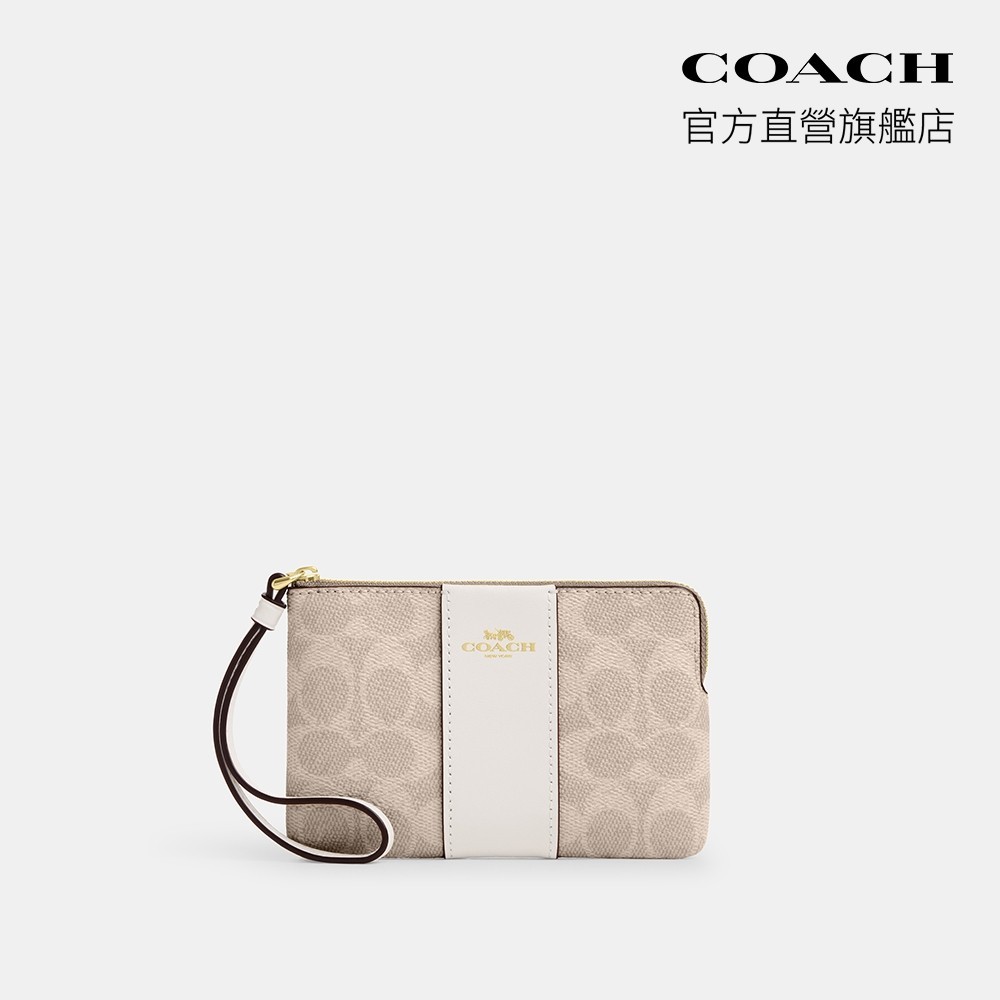 【COACH】經典Logo條紋圖案角拉鍊手腕包-IM/沙黃色/粉筆白色(CW854)|官方直營IM/沙黃色/粉筆白色COACH官方旗艦店