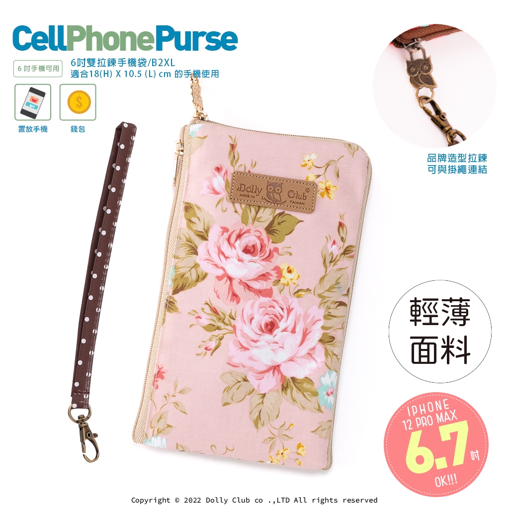 【Dolly Club】雙拉手機包 多色可選 iphone 6.7吋 手機套 附手挽繩 防水印花布包 花卉 台灣製