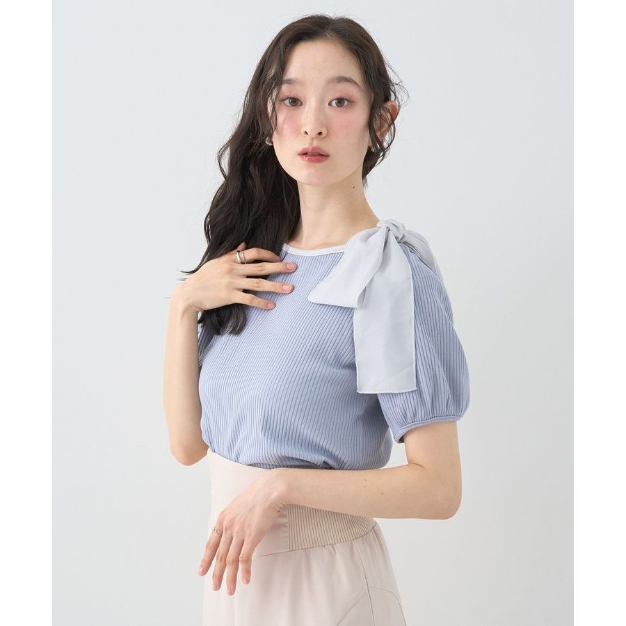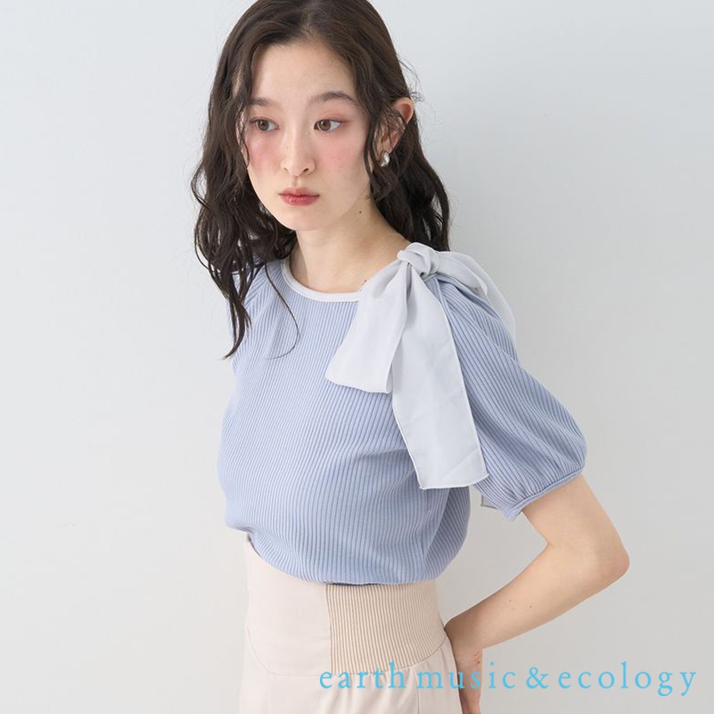 earth music&ecology 單肩蝴蝶結設計彈性羅紋短袖上衣(01000699700)象牙色F|黑色F|灰藍色FT-shirtsearth music&ecology Select Store
