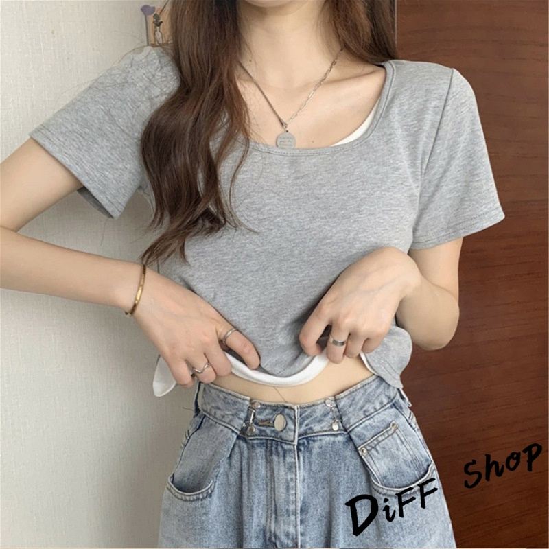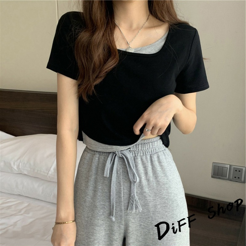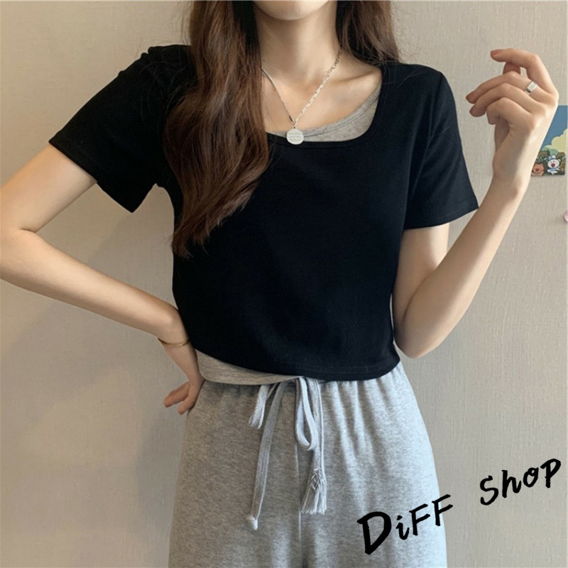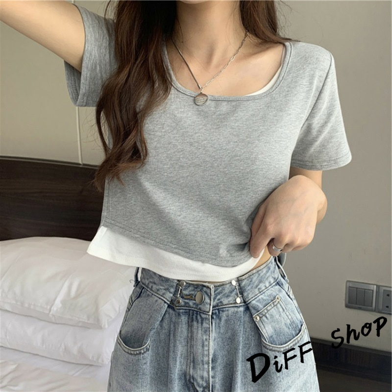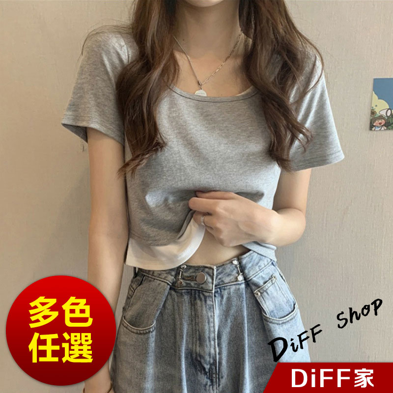 【DIFF】韓版設計感假兩件寬鬆舒適短版上衣 短袖上衣 短袖t恤 女裝 衣服 寬鬆上衣 素T 短板上衣【T325】【T325】白色|【T325】黑色|【T325】灰色T-shirtsDiFF shop