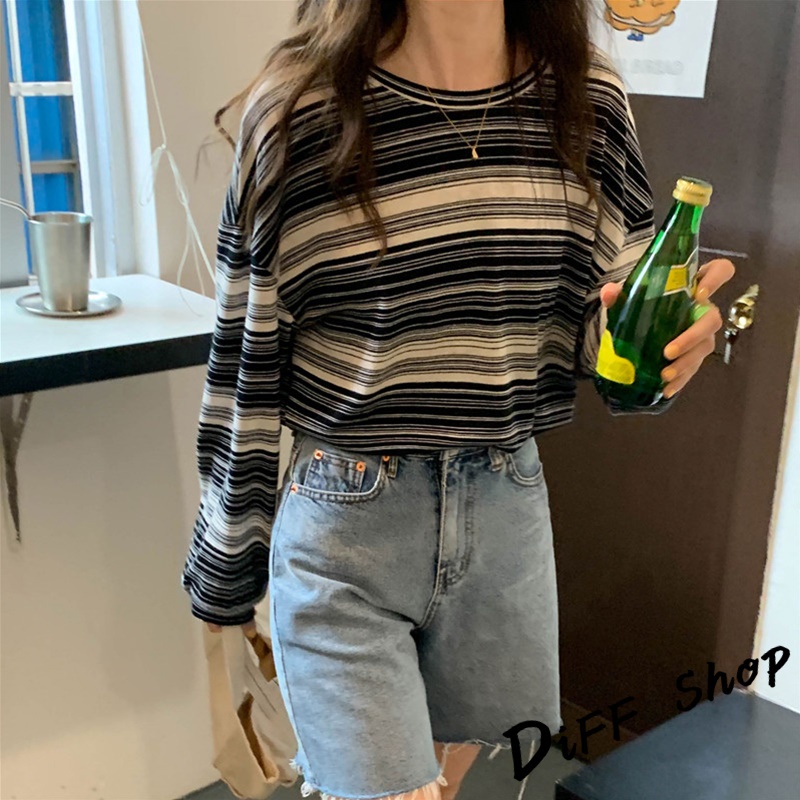 【DIFF】韓版薄款條紋長袖上衣 女裝 衣服 寬鬆上衣 顯瘦上衣 長袖t恤 冬裝 防曬上衣【W284】【W284】黑色|【W284】藍色|【W284】軍綠T-shirtsDiFF shop