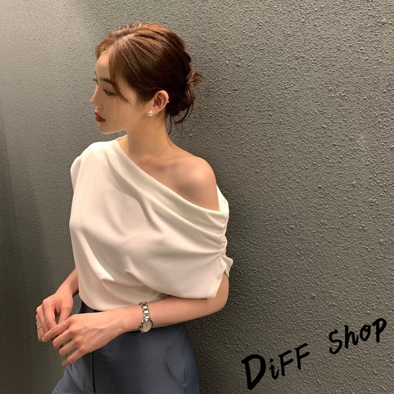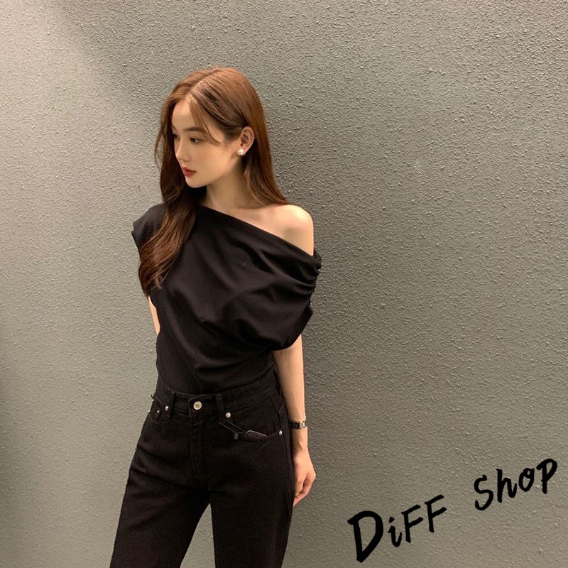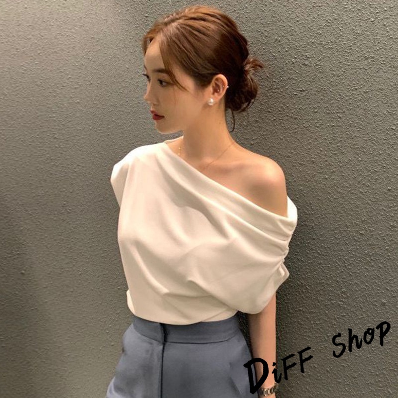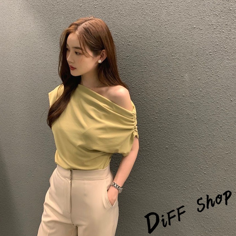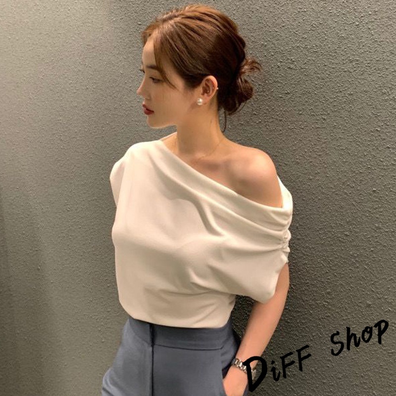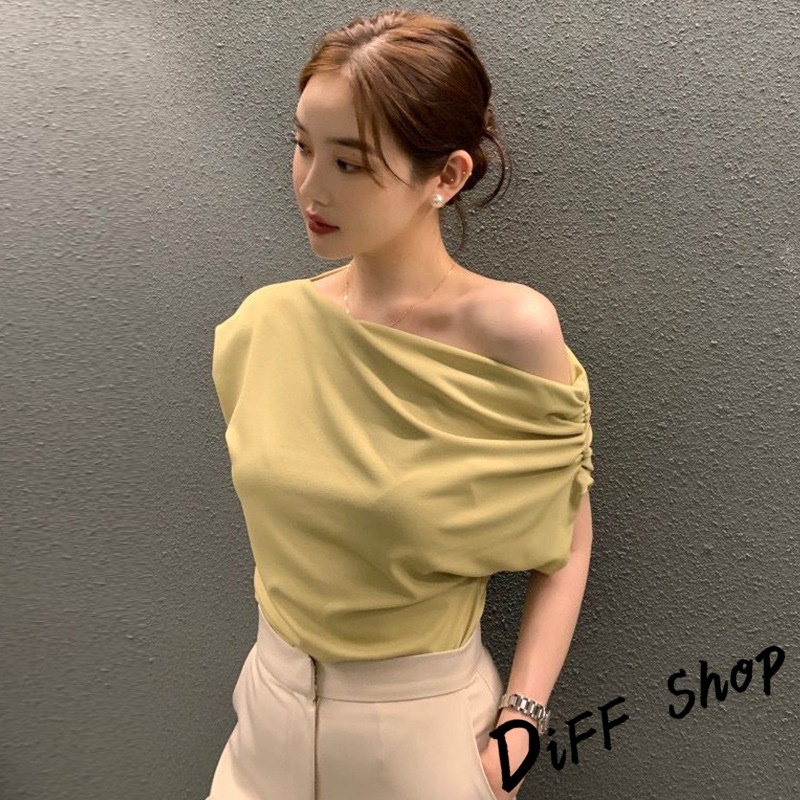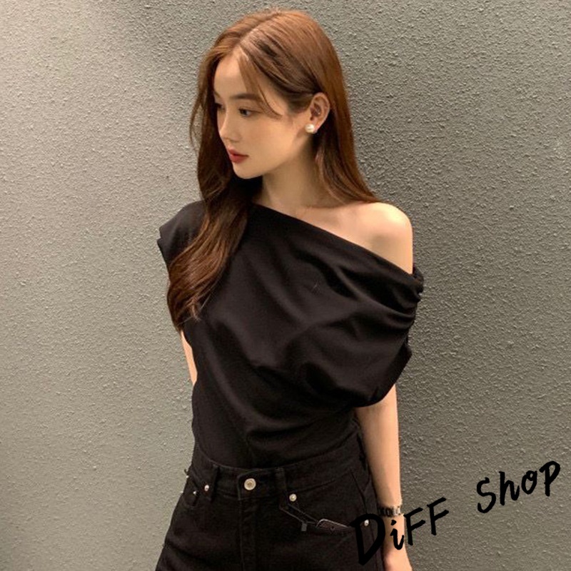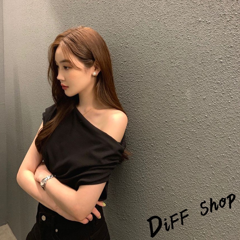 【DIFF】韓版法式氣質斜肩露肩短袖上衣 短袖t恤 女裝 顯瘦上衣 衣服 寬鬆上衣 素T【T603】【T603】黑色|【T603】白色|【T603】黃綠T-shirtsDiFF shop