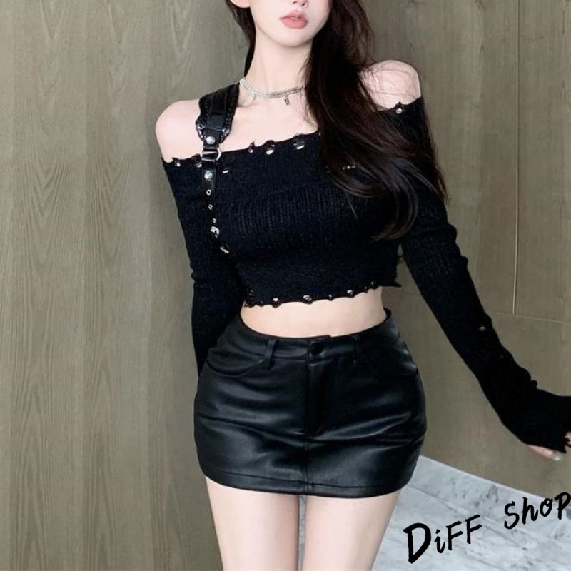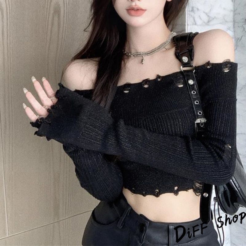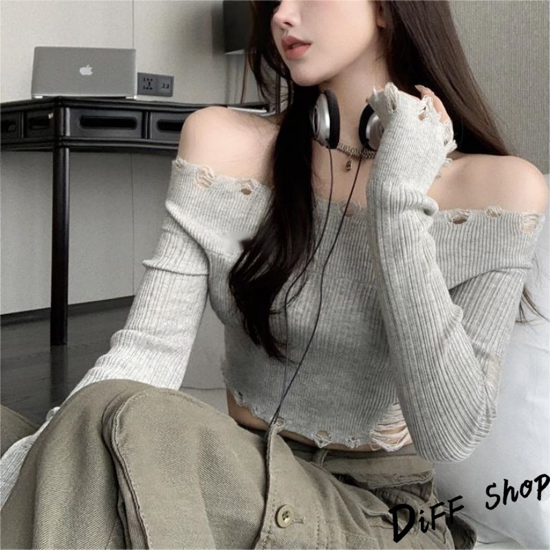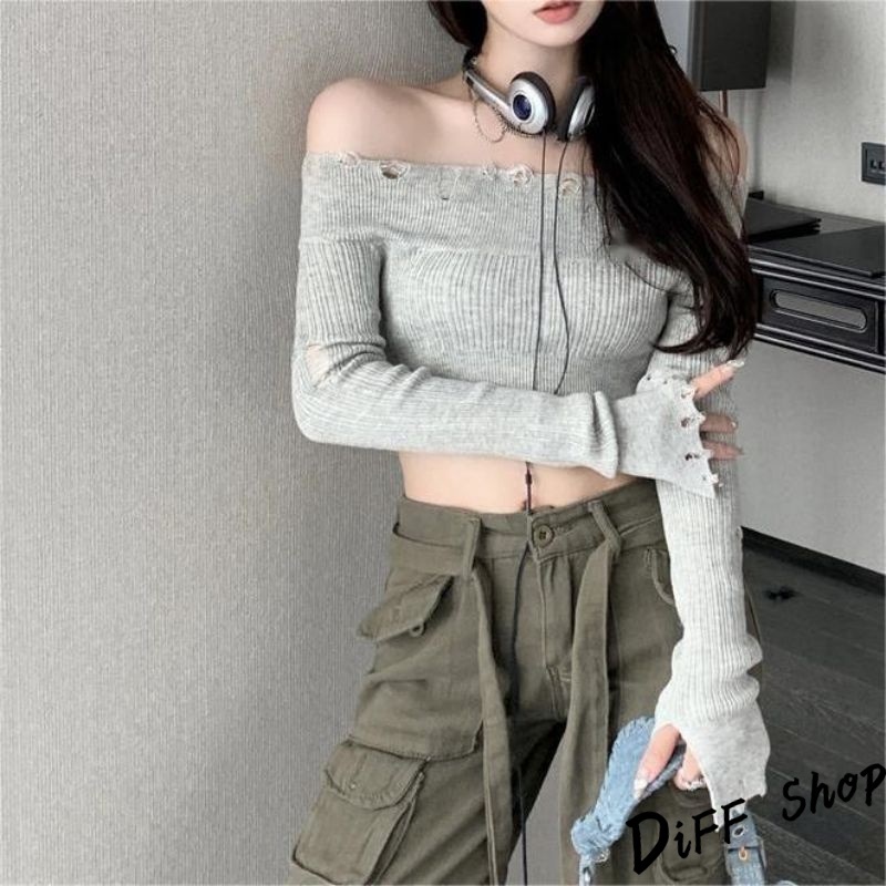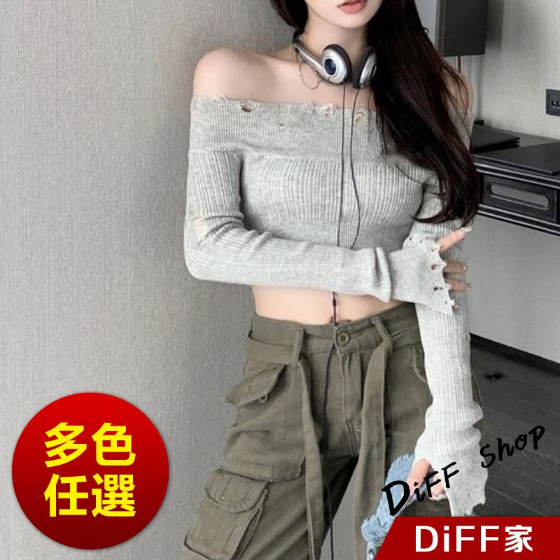 【DIFF】韓版薄款刷破顯瘦一字領短版針織上衣 長袖上衣 短版上衣 女裝 衣服 顯瘦上衣 長袖t恤 冬裝【W431】【W431】淺灰色|【W431】黑色DiFF shop