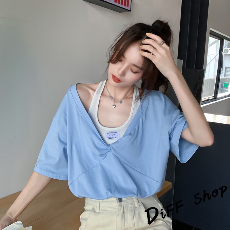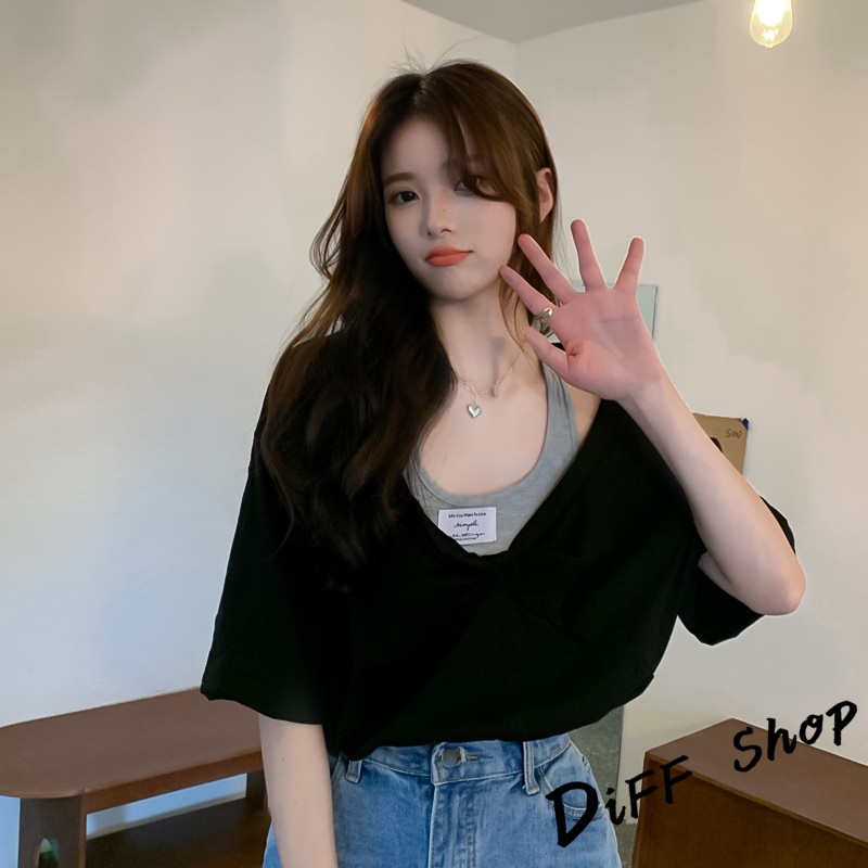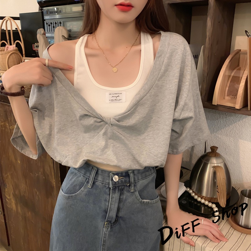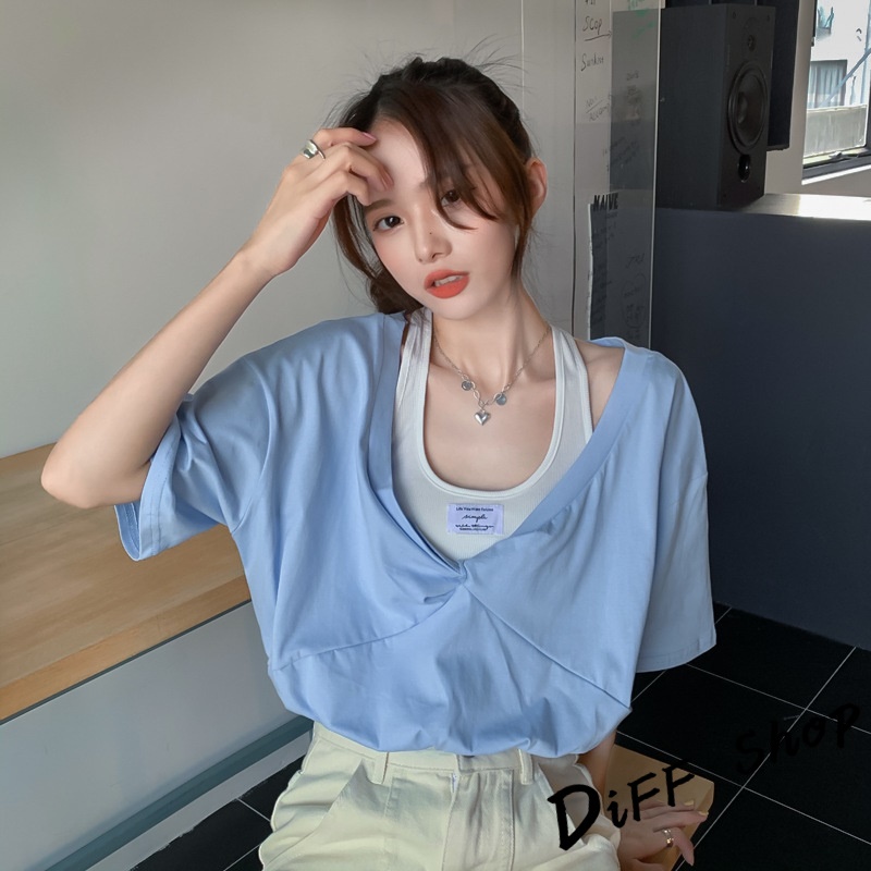【DiFF】韓版設計感假兩件小眾寬鬆短款上衣 短袖上衣 短袖t恤 女裝 衣服 寬鬆上衣 素T 短板上衣【T388】【T388】藍色|【T388】黑色|【T388】灰色|【T388】白色T-shirtsDiFF shop