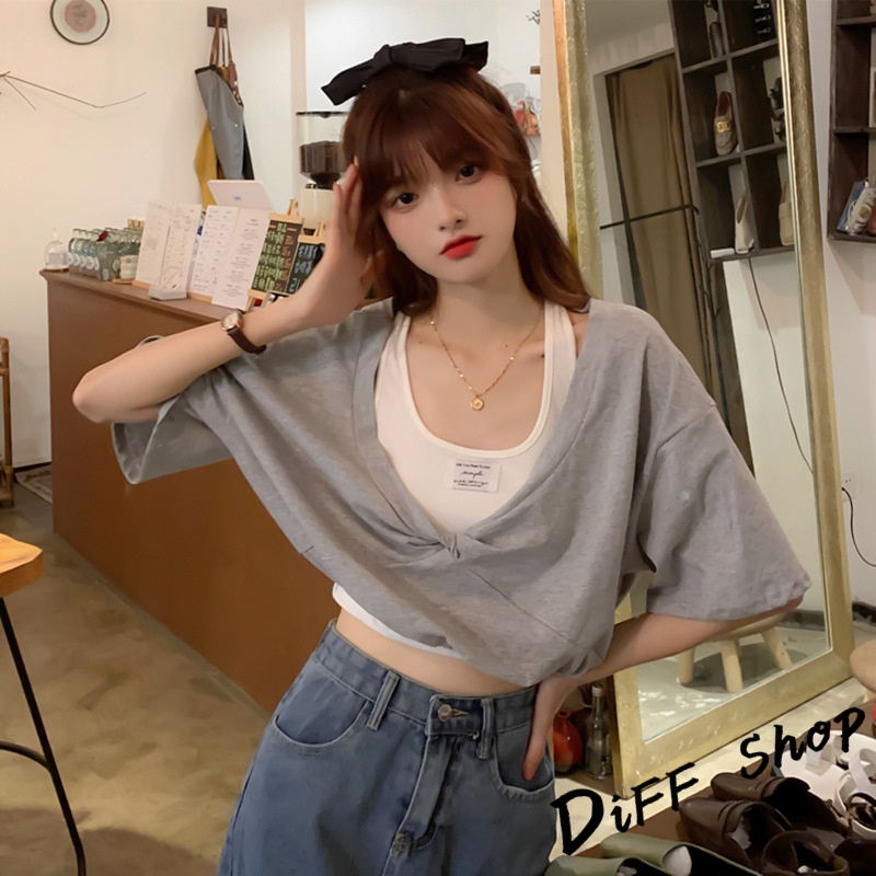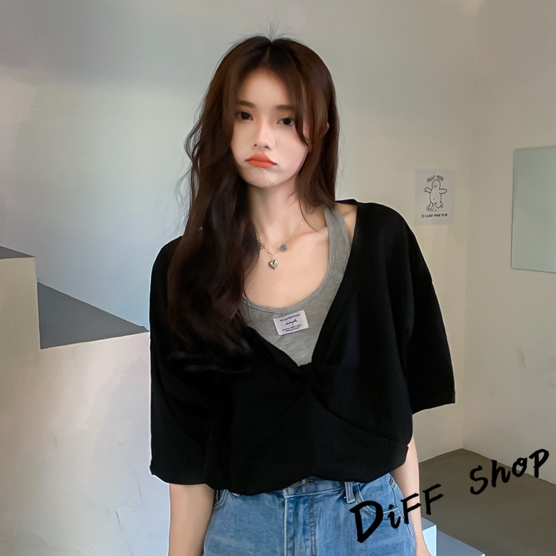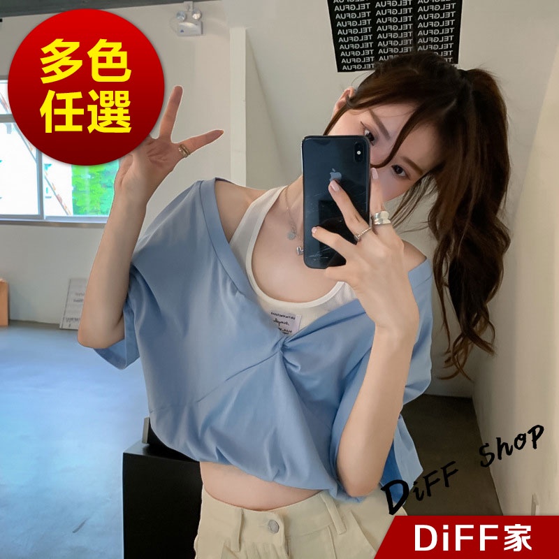【DiFF】韓版設計感假兩件小眾寬鬆短款上衣 短袖上衣 短袖t恤 女裝 衣服 寬鬆上衣 素T 短板上衣【T388】