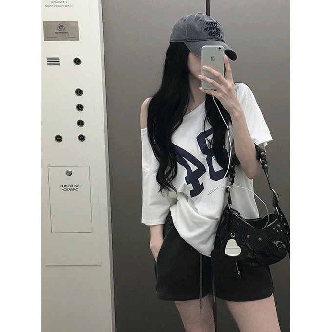 Codibook|韓國 henique 寬鬆印花露肩短袖T恤[預購]短袖上衣 女裝白色T-shirtsCodibook 韓國女裝購物平台