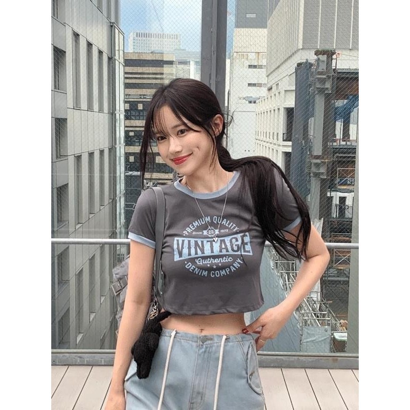 Codibook|韓國 Dayroze 仿舊印花拼色短版T恤[預購]短袖上衣 T恤 女裝象牙白|深灰色|黑色T-shirtsCodibook 韓國女裝購物平台