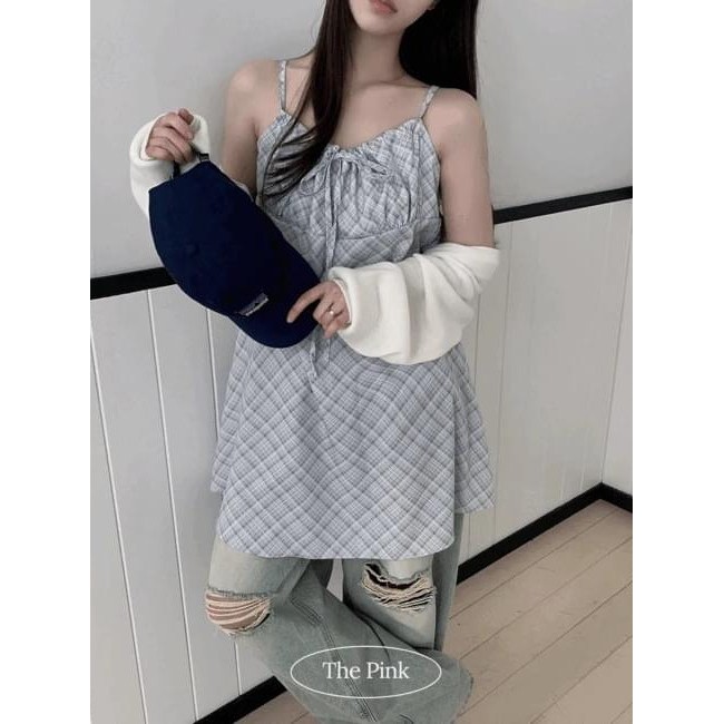 Codibook|韓國 thepink 灰色格紋拼接荷葉邊細肩帶洋裝[預購]迷你短洋裝 雪紡襯衫 女裝白色,free|黑色,freeCodibook 韓國女裝購物平台
