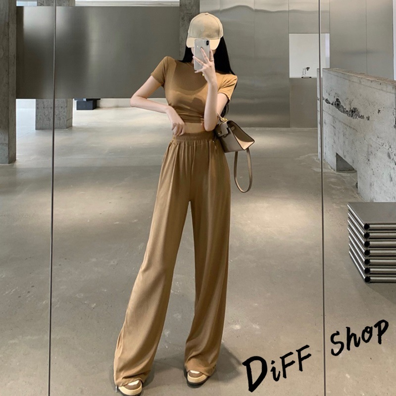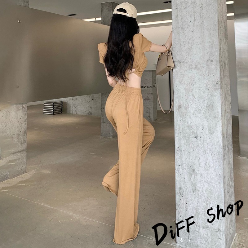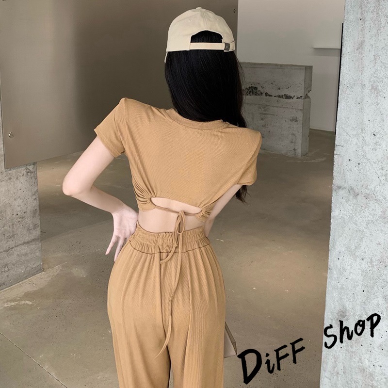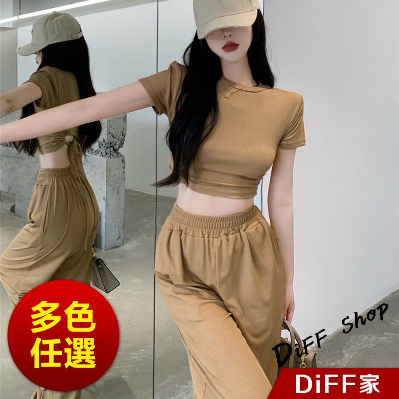 【DIFF】韓版小心機露背短版上衣+薄款寬褲 短袖上衣 短袖t恤 女裝 寬褲 褲子 長褲 女裝 高腰褲【S299】【S299】黑色|【S299】白色|【S299】卡其Individual SetsDiFF shop