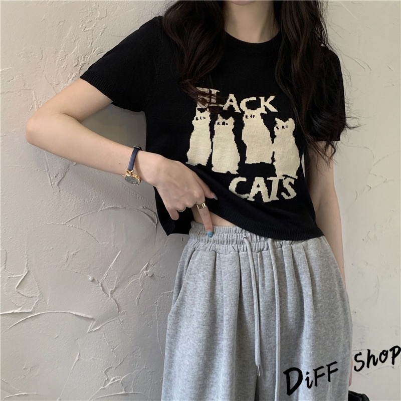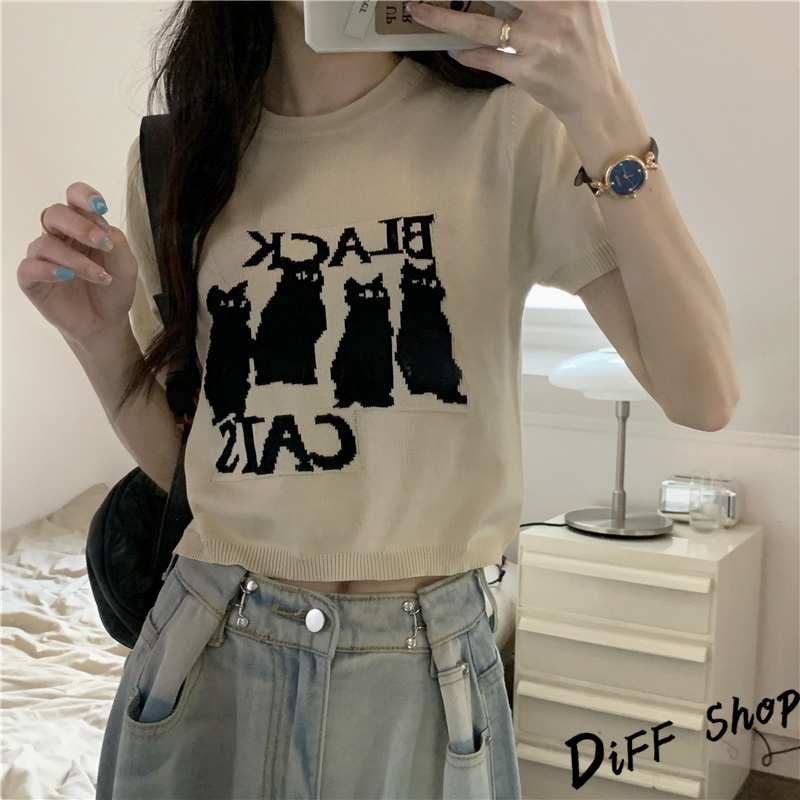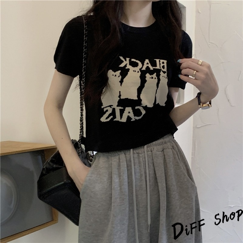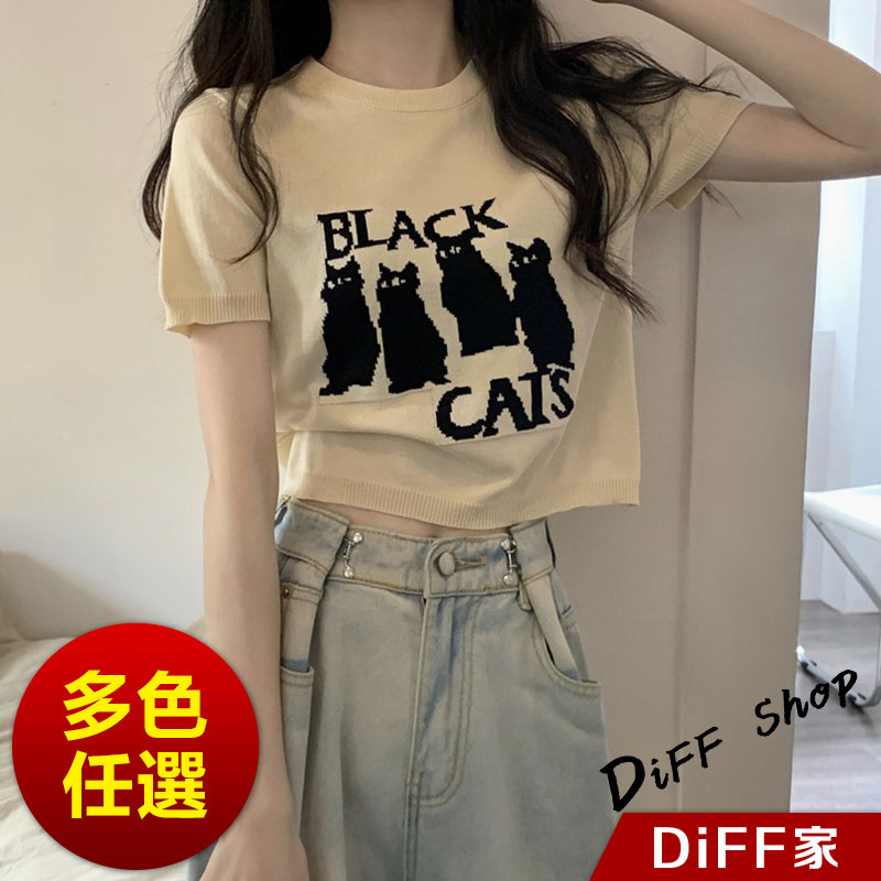 【DIFF】韓版寬鬆貓咪針織上衣 短版上衣 短袖上衣 短袖t恤 女裝 顯瘦上衣 衣服 寬鬆上衣 短板上衣【T518】【T518】黑色|【T518】卡其T-shirtsDiFF shop