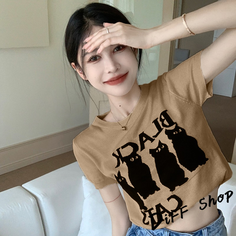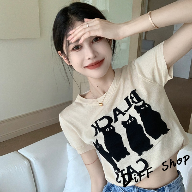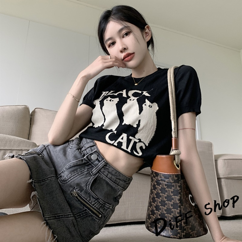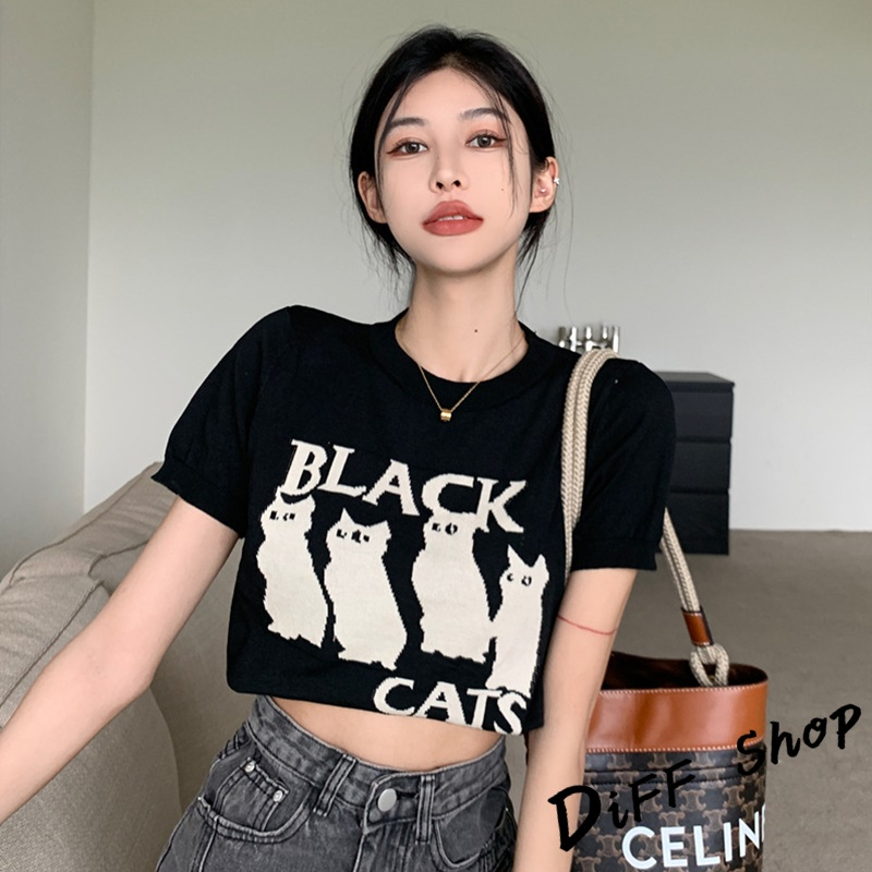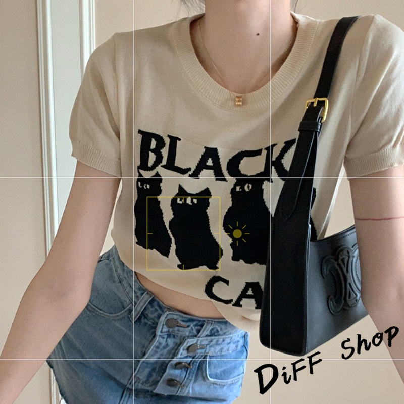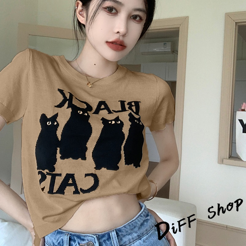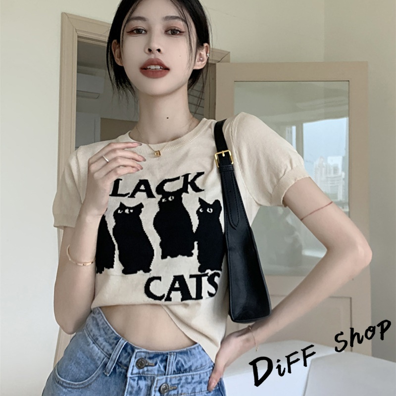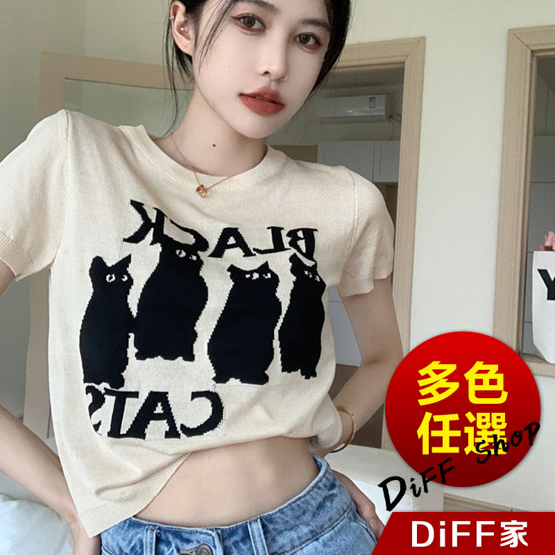 【DIFF】韓版甜酷風寬鬆貓咪針織上衣 短袖上衣 短袖t恤 女裝 顯瘦上衣 衣服 寬鬆上衣【T518】【T518】黑色|【T518】白色|【T518】卡其T-shirtsDiFF shop
