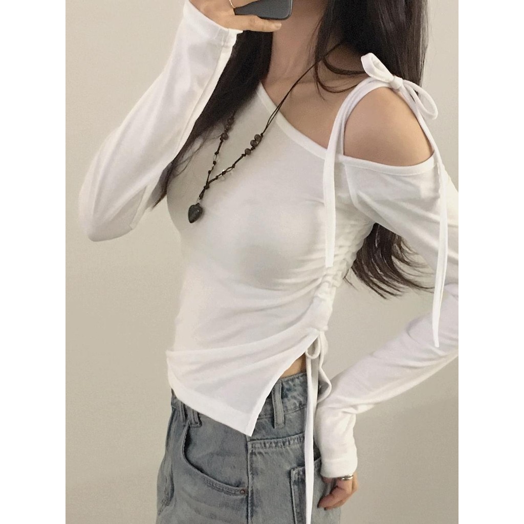 Codibook|韓國 ondeed 一字肩綁帶設計抽褶開叉上衣[預購]長袖上衣 T恤 女裝象牙白,FREE|卡其色,FREE|粉紅色,FREE|深灰色,FREE|黑,FREET-shirtsCodibook 韓國女裝購物平台