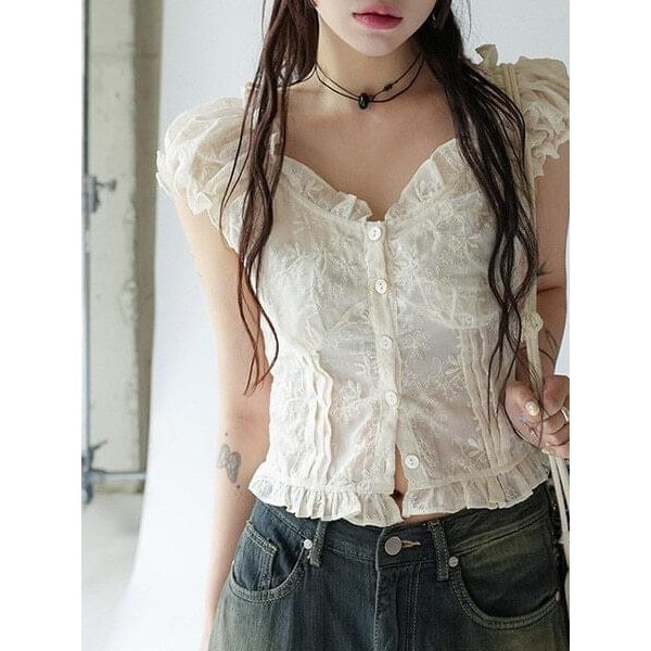 Codibook|韓國 binary01 荷葉邊蕾絲短袖修身襯衫[預購]雪紡襯衫 女裝象牙白,FREEShirts & BlousesCodibook 韓國女裝購物平台