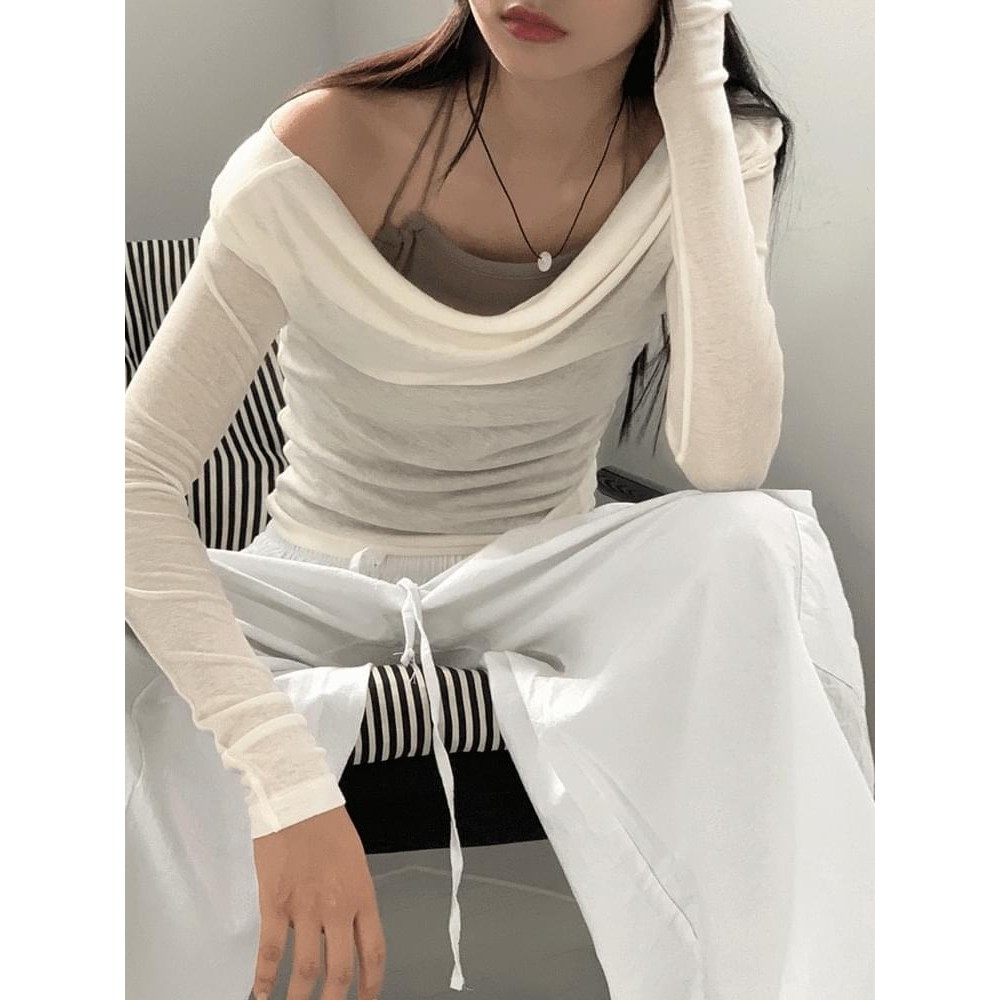 Codibook|韓國 wonderwonder 削肩式綁帶垂墜式長袖上衣[預購]長袖上衣 女裝黑色,FREE|象牙白,FREE|米粉色,FREET-shirtsCodibook 韓國女裝購物平台
