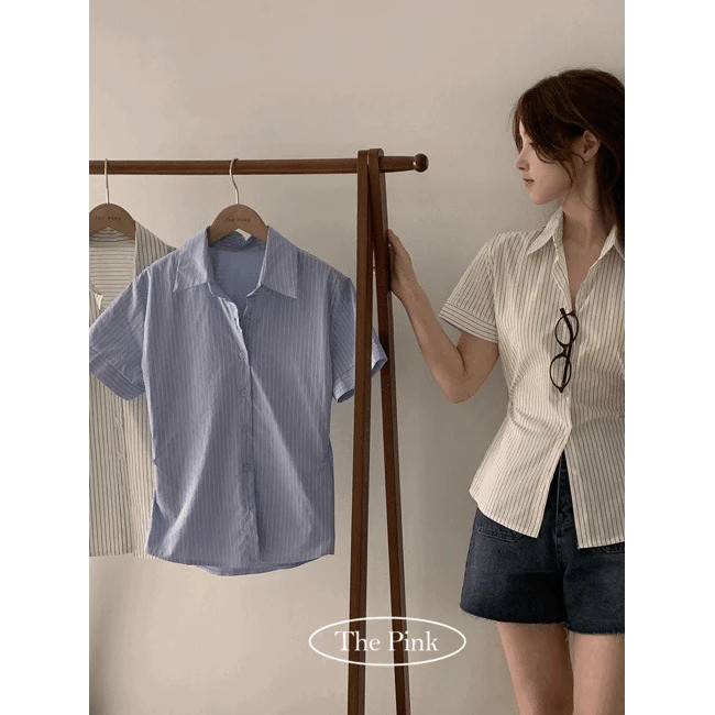 Codibook|韓國 thepink 寬鬆條紋按扣短袖襯衫[預購]襯衫 女裝白色,free|天空藍,free|米褐色,freeShirts & BlousesCodibook 韓國女裝購物平台
