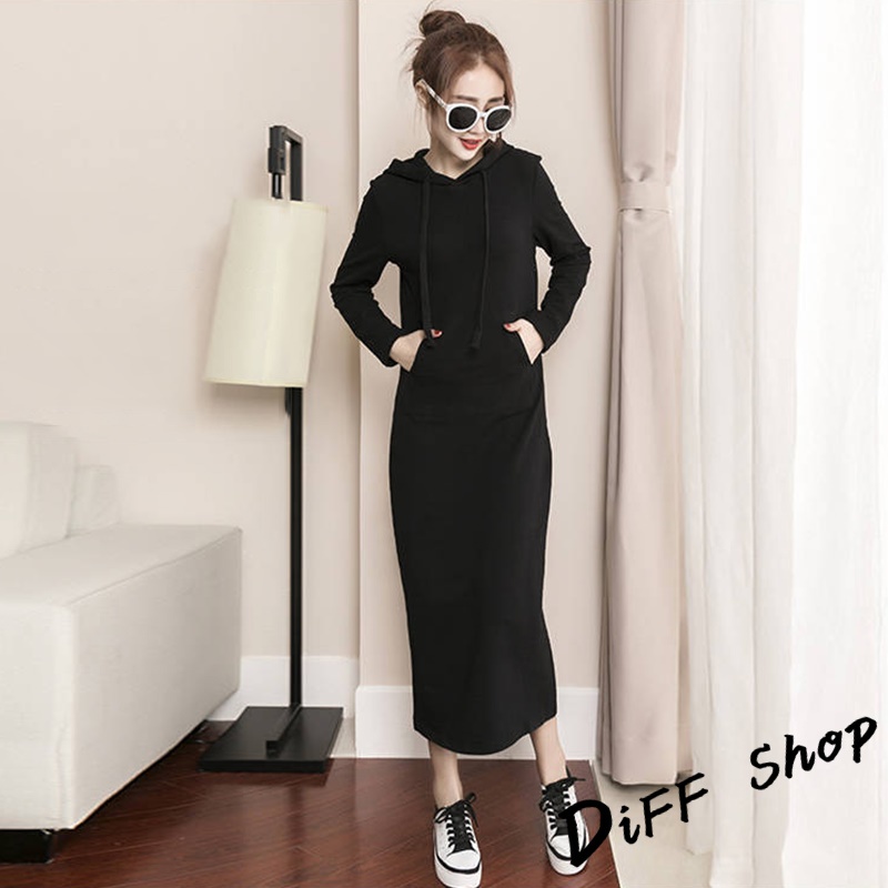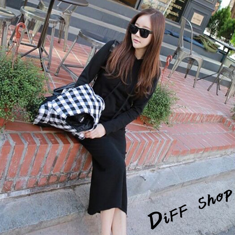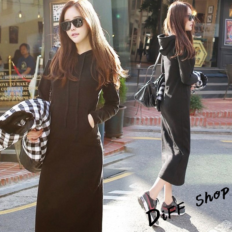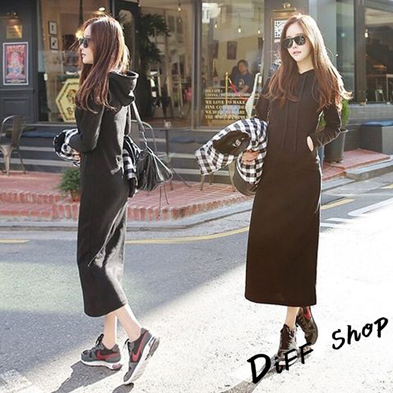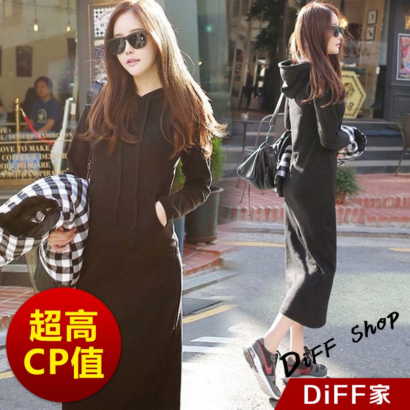 【DIFF】韓版休閒長版連帽連衣裙 長袖上衣 連身裙 套裝 帽T 連帽上衣 女裝 衣服 寬鬆上衣 長袖t恤【S221】【S221】黑色DiFF shop