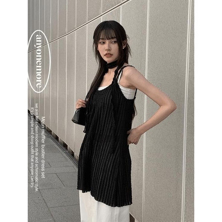 Codibook|韓國 anyonemore 修身細肩帶迷你洋裝圍巾套裝[預購]及膝洋裝 細肩帶緞面洋裝 女裝free,象牙白|free,黑色Codibook 韓國女裝購物平台