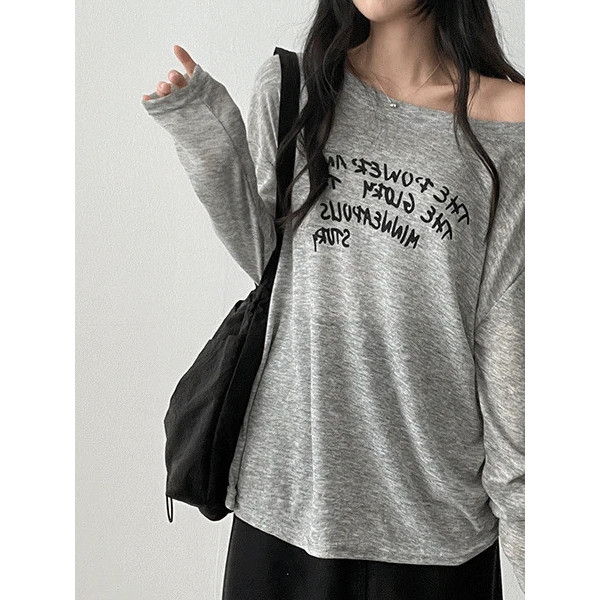 Codibook|韓國 HIJJOO 字母斜肩透膚長袖T恤[預購]長袖上衣 女裝黑色|灰色|象牙白T-shirtsCodibook 韓國女裝購物平台