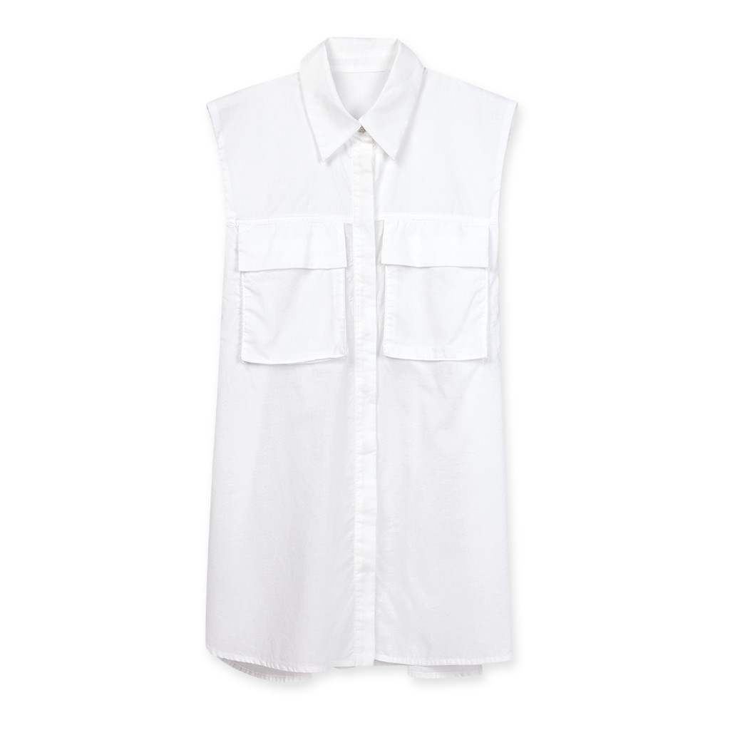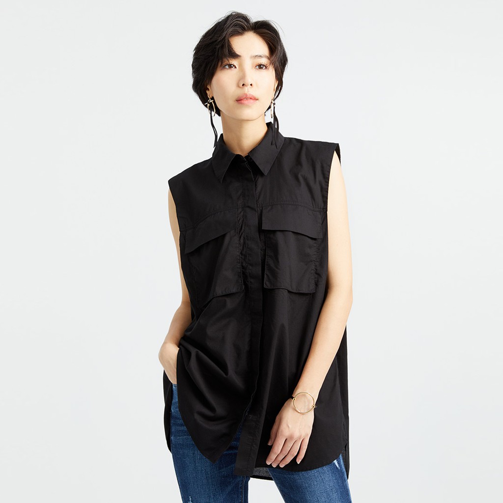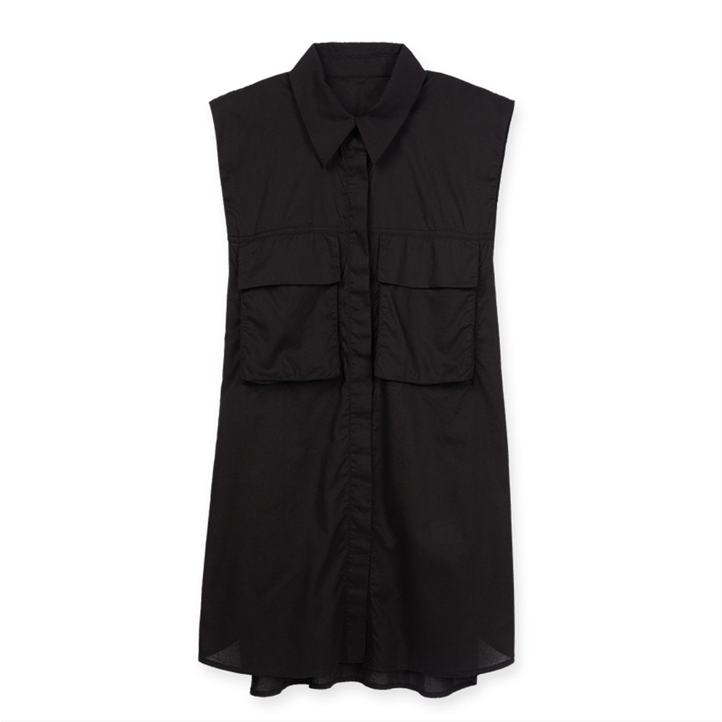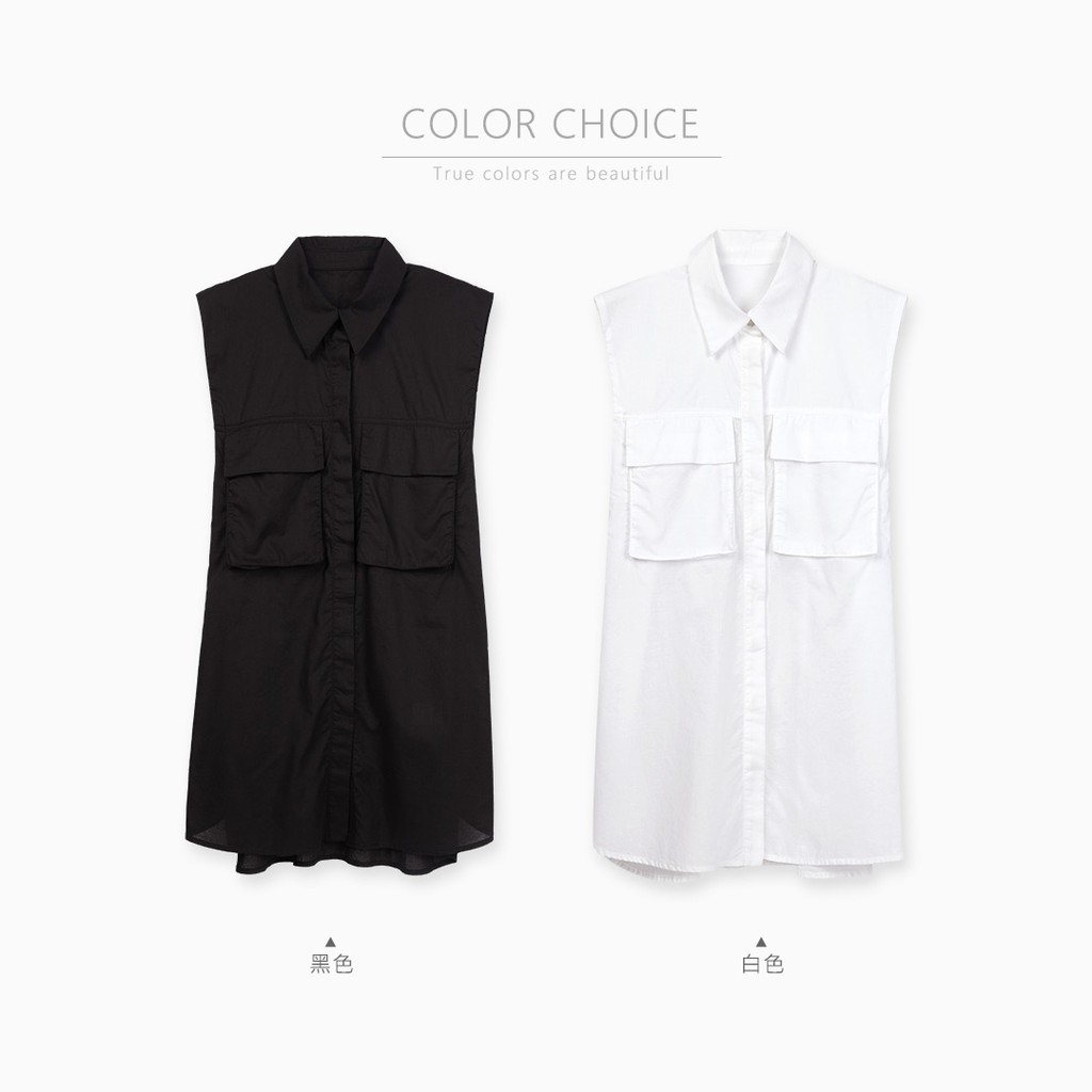 【ERSS】女裝 襯衫 長版襯衫 女襯衫 上衣 無袖 大貼袋 寬鬆 黑色 【K40023】