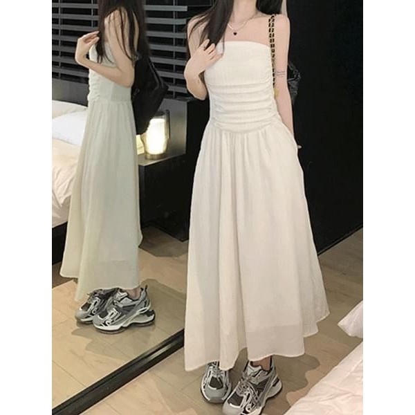 Codibook|韓國 Wansmall 荷葉細肩帶方領長款連身洋裝[預購]長洋裝 細肩帶緞面洋裝 女裝奶油色,FREE-(op31182)Codibook 韓國女裝購物平台