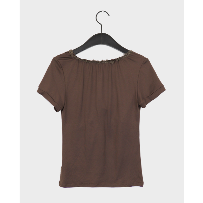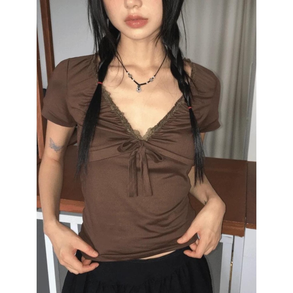 Codibook|韓國 wonderwonder 棕色V領荷葉邊綁帶短袖T恤[預購]短袖上衣 T恤 女裝咖啡色,FREET-shirtsCodibook 韓國女裝購物平台