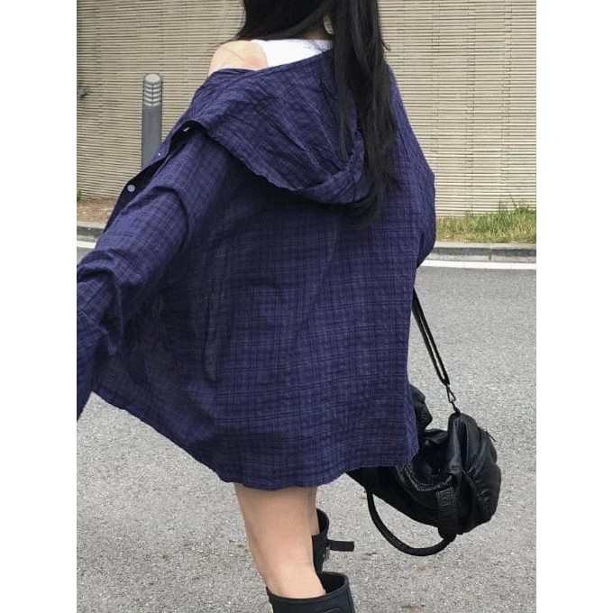 Codibook|韓國 henique 寬鬆格紋連帽襯衫[預購]襯衫 雪紡襯衫 女裝海軍藍Shirts & BlousesCodibook 韓國女裝購物平台