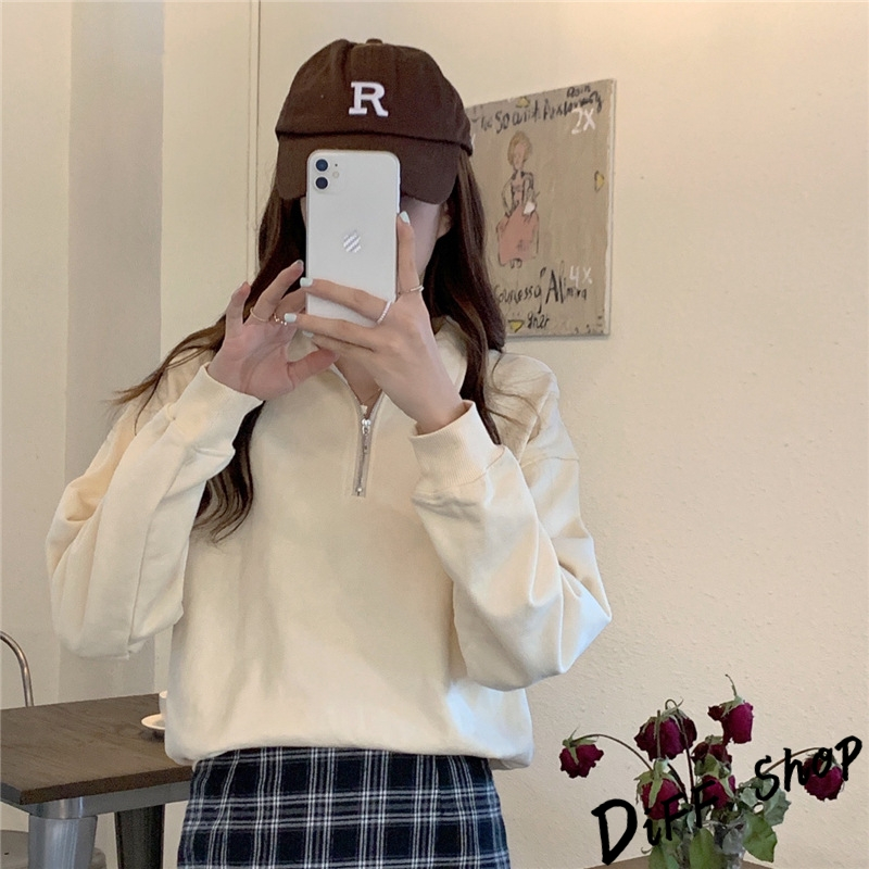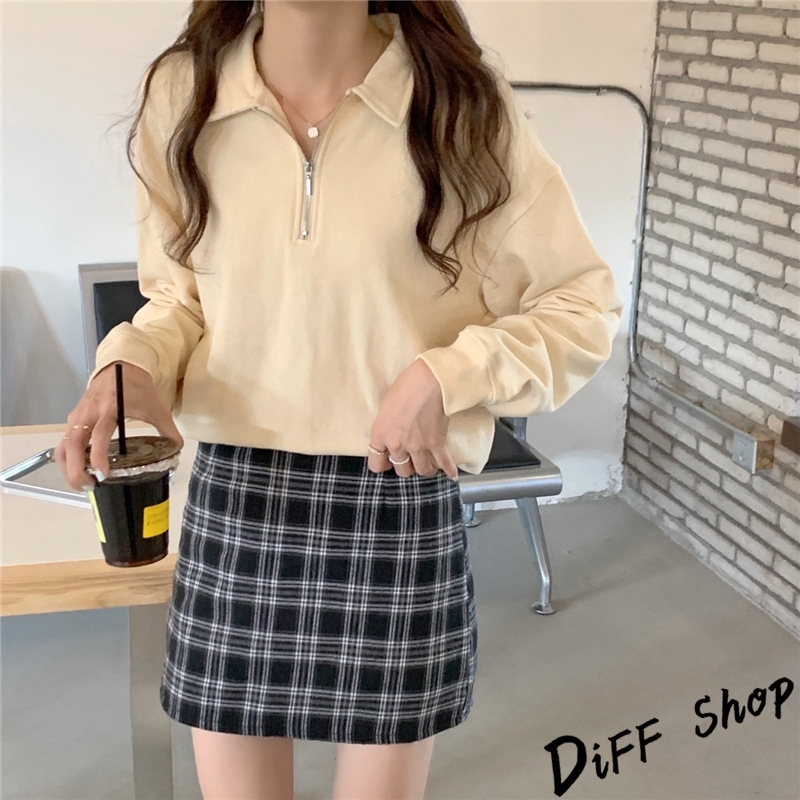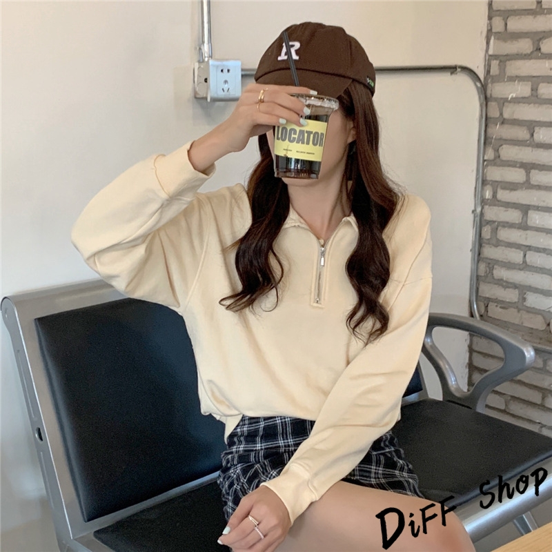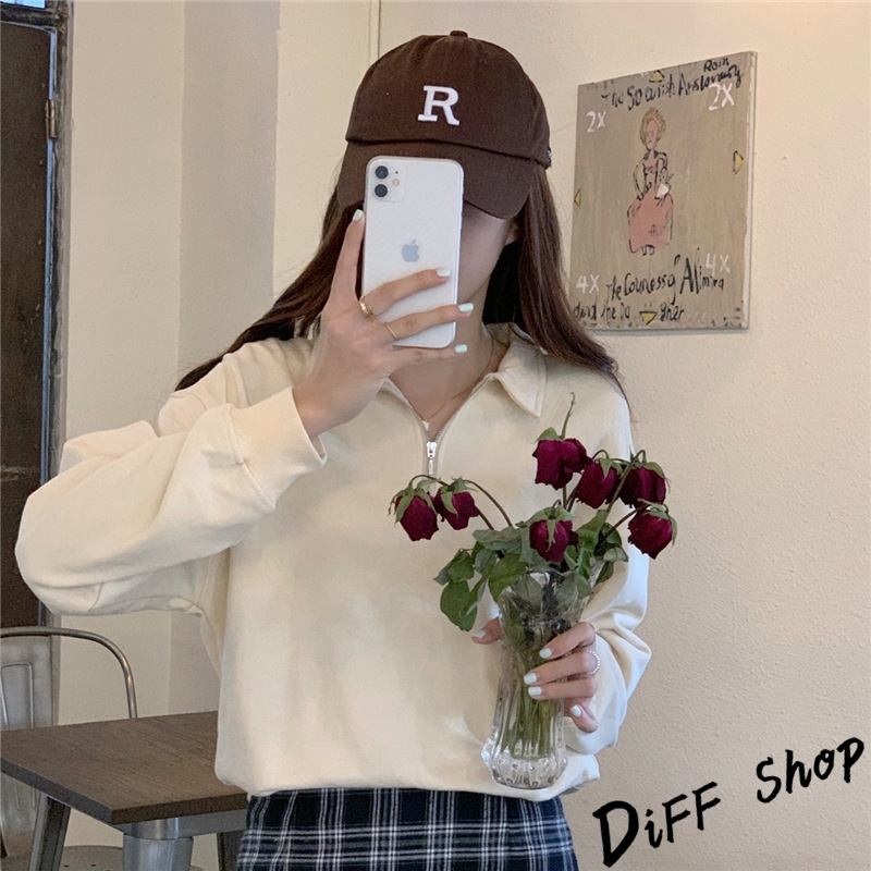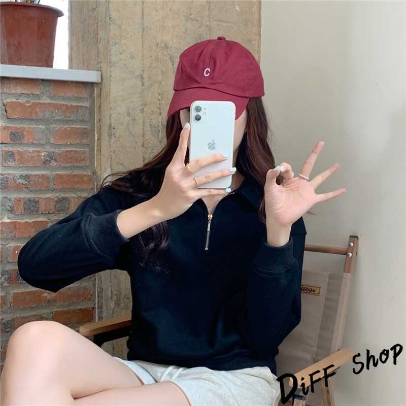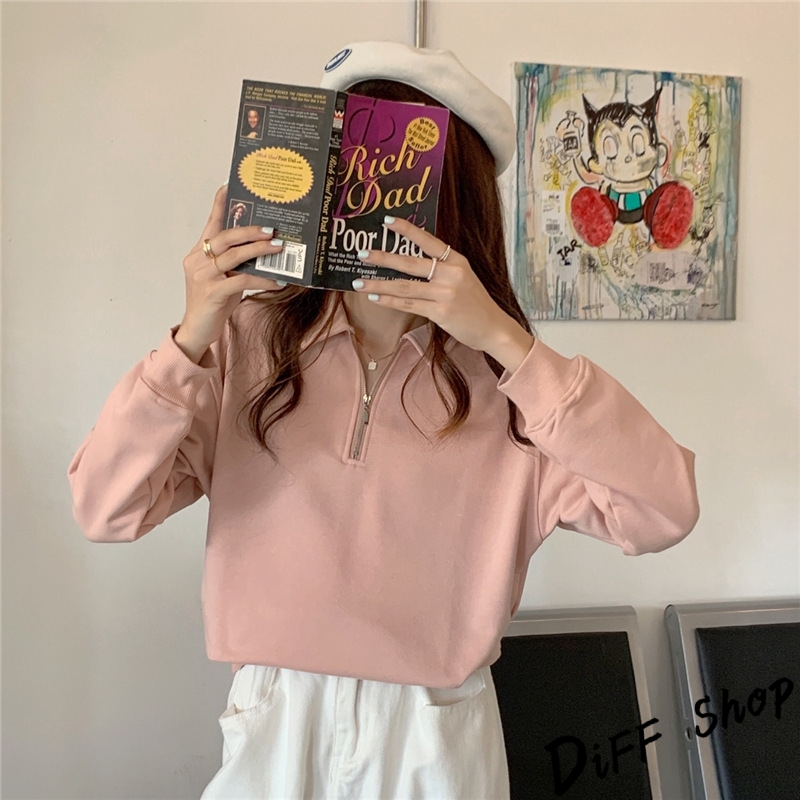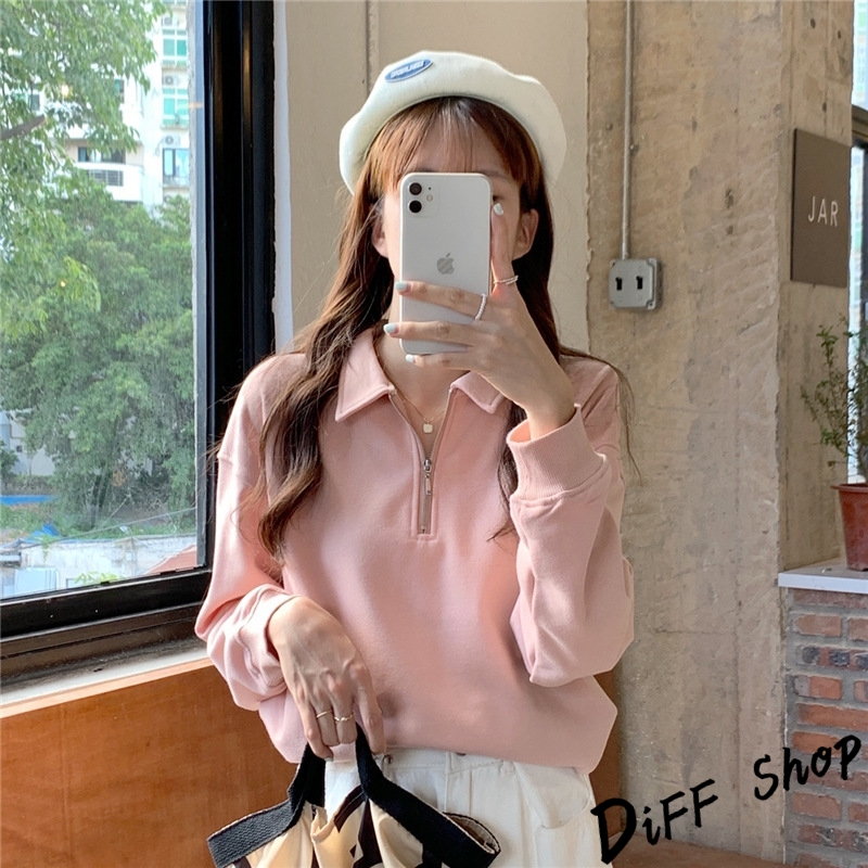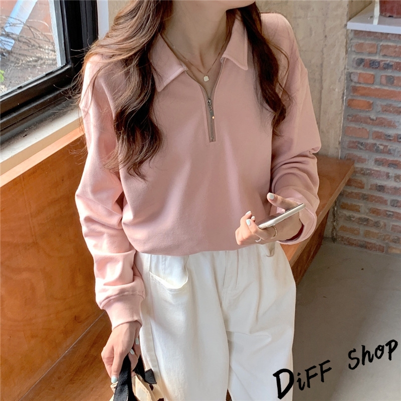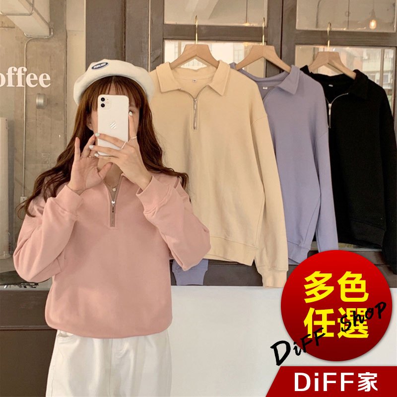 【DIFF】韓版簡約寬鬆顯瘦拉鍊長袖上衣 女裝 衣服 寬鬆上衣 顯瘦上衣 長袖t恤 大學T 冬裝 素T【W495】【W495】黑色|【W495】粉色|【W495】紫色|【W495】淺杏色Polo ShirtsDiFF shop