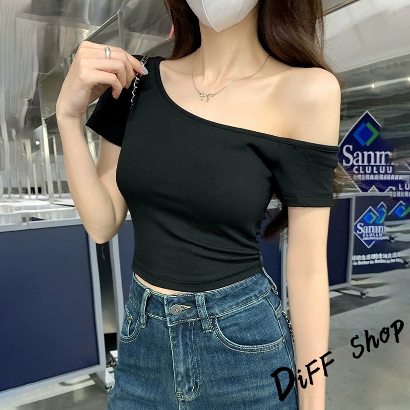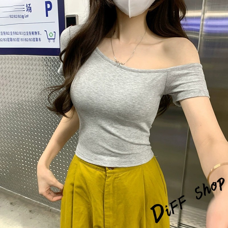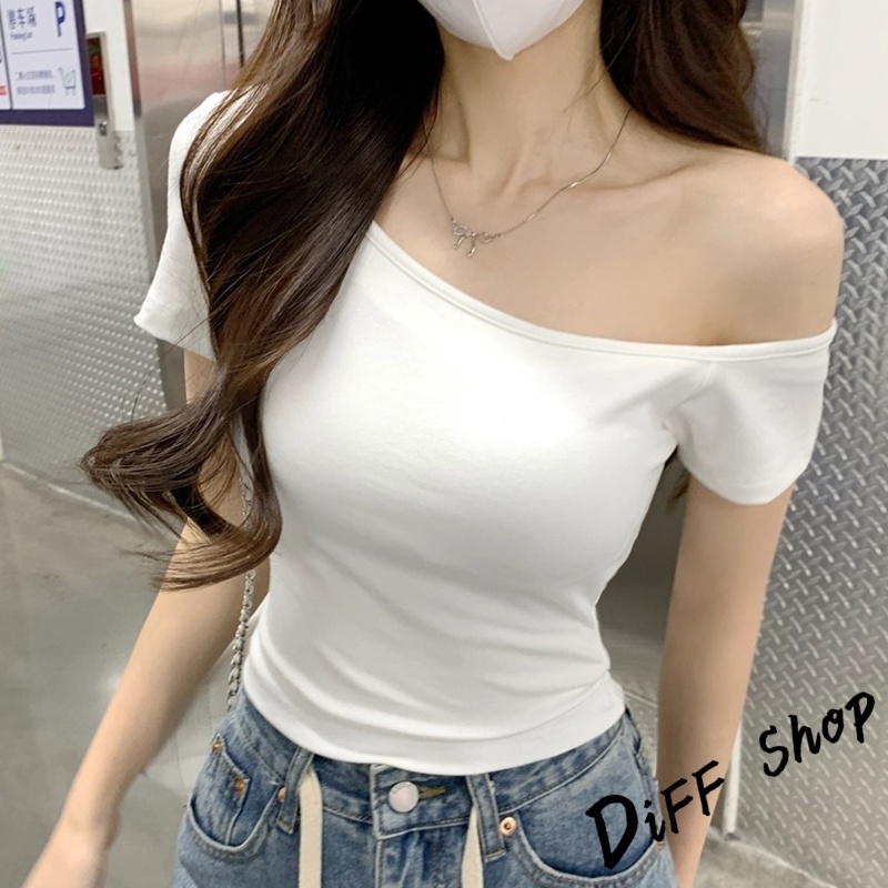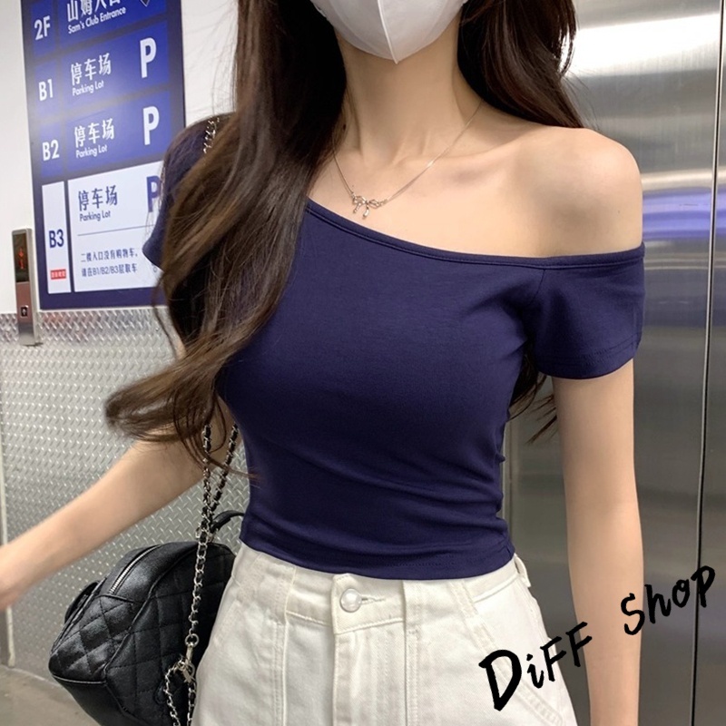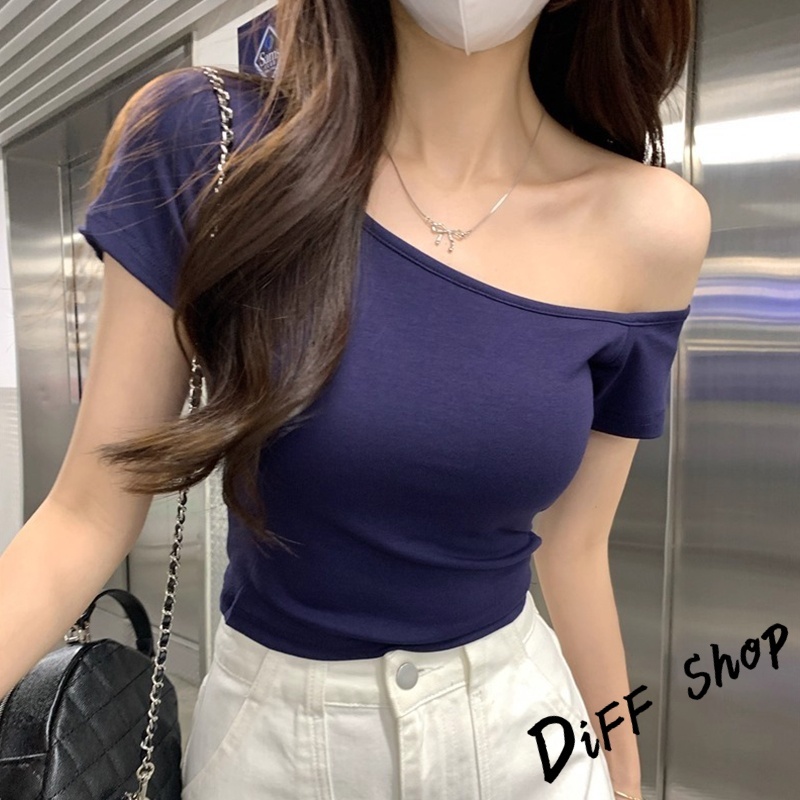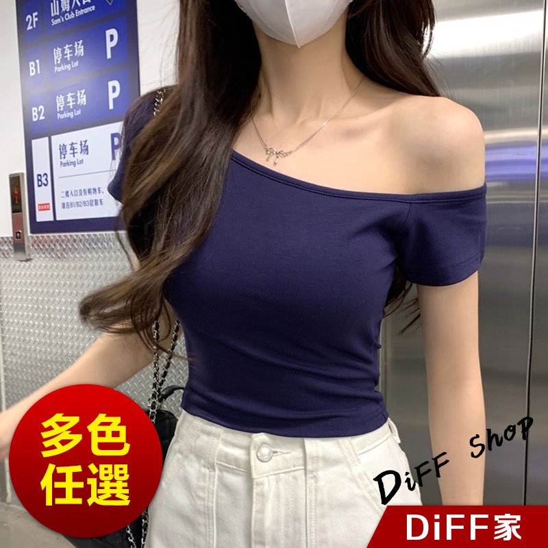 【DIFF】韓版斜肩顯瘦露肩上衣 短袖上衣 衣服 夏天女裝 短板上衣 短版t恤 女裝 短袖t恤女 短版上衣【T616】【T616】酒紅|【T616】白色|【T616】深藍色|【T616】紫色|【T616】黑色T-shirtsDiFF shop
