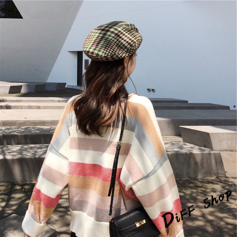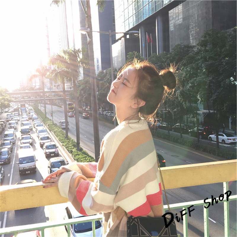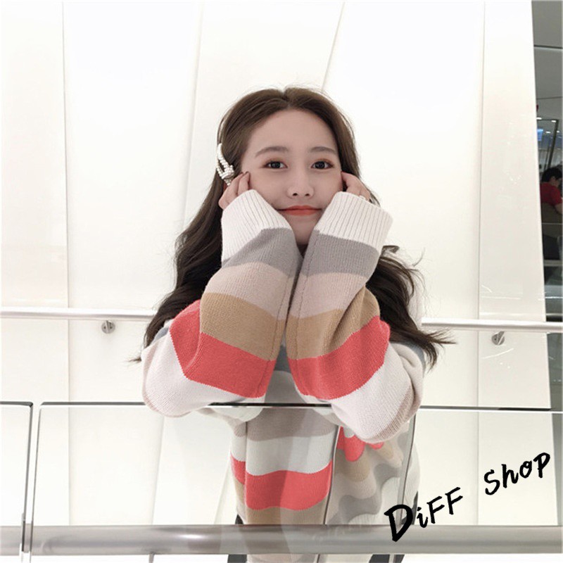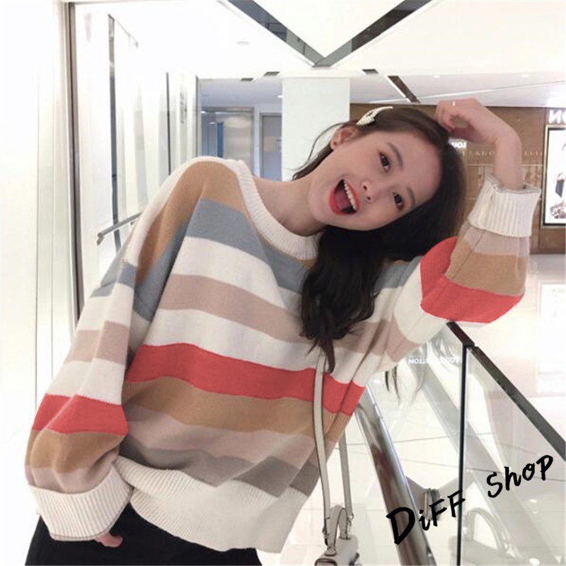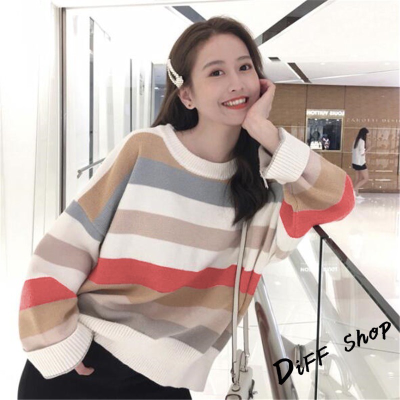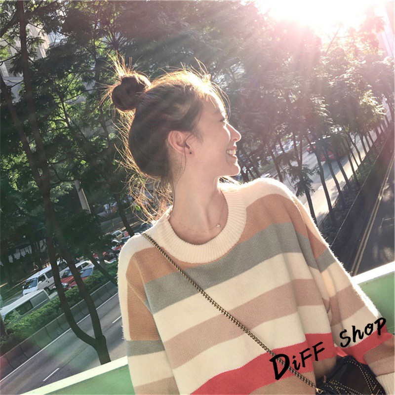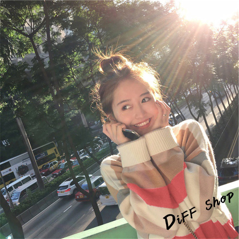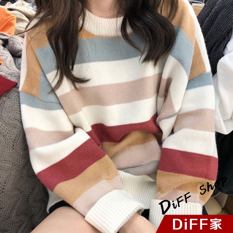 【DIFF】秋冬韓版網紅慵懶寬鬆甜美條紋長袖上衣 毛衣 長袖t恤 大學T 女裝 衣服 寬鬆上衣 顯瘦 素T【W124】【W124】圖片色SweatshirtsDiFF shop