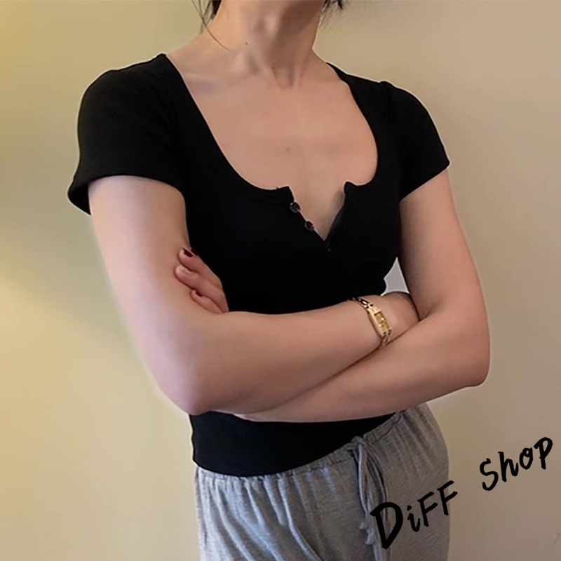 【DIFF】韓版復古鈕扣短版上衣 短袖上衣 衣服 夏天女裝 短板上衣 短版t恤 女裝 短袖t恤女 顯瘦上衣【T668】【T668】白色|【T668】淺灰色|【T668】黑色|【T668】咖色|【T668】橘紅色T-shirtsDiFF shop