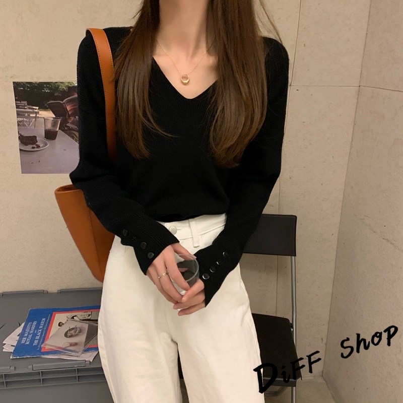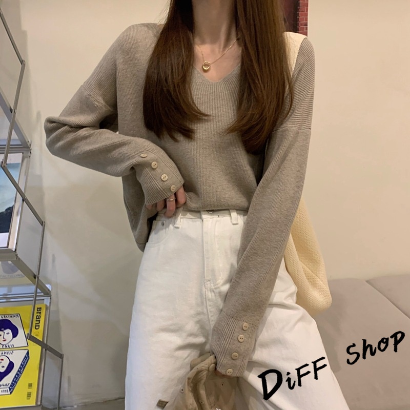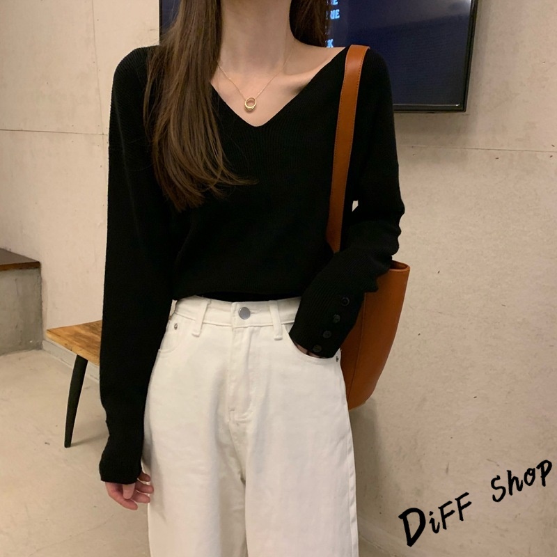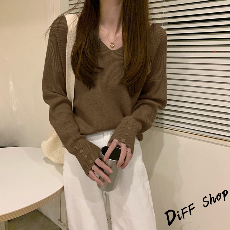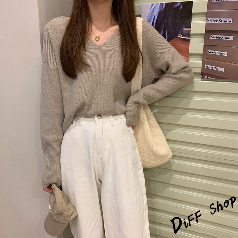 【DIFF】韓版寬鬆V領百搭針織上衣 長袖上衣 女裝 衣服 寬鬆上衣 顯瘦上衣 冬裝 長袖t恤 素T 毛衣 【S99】【S99】咖啡|【S99】杏色|【S99】黑色DiFF shop