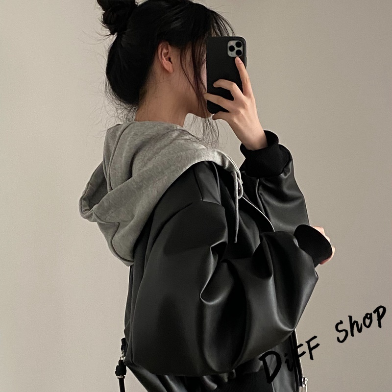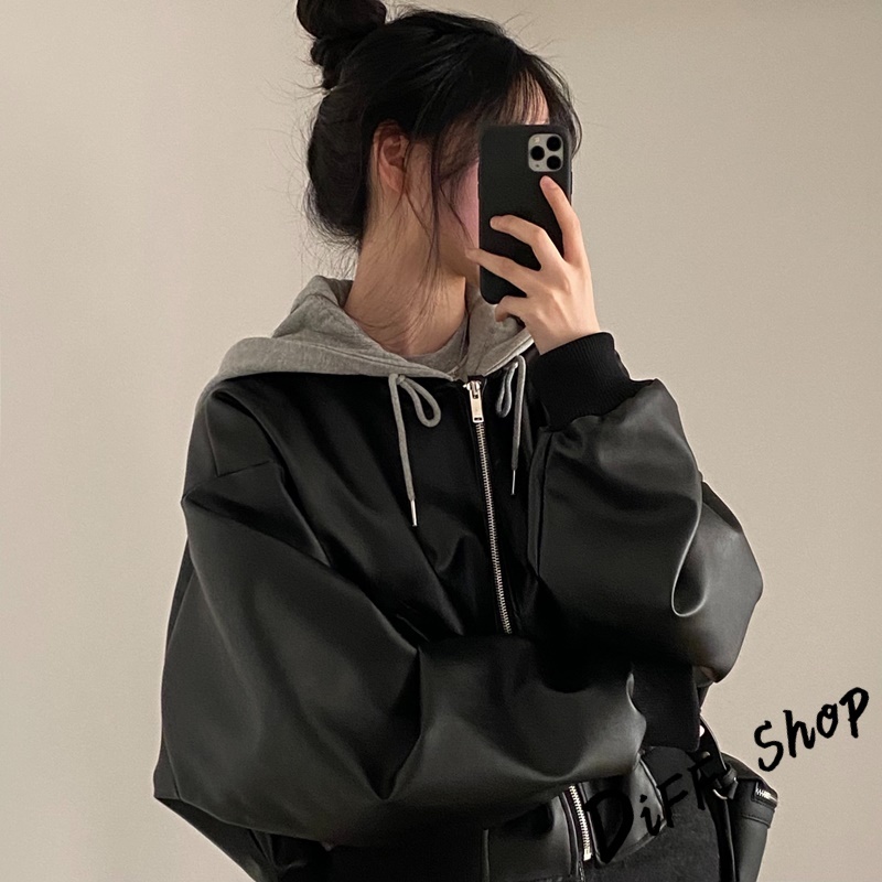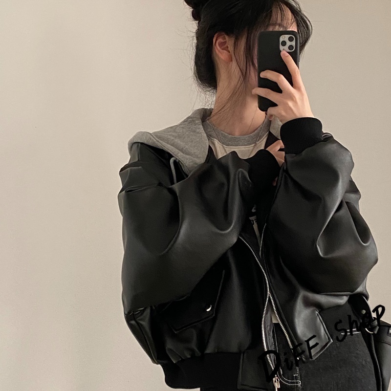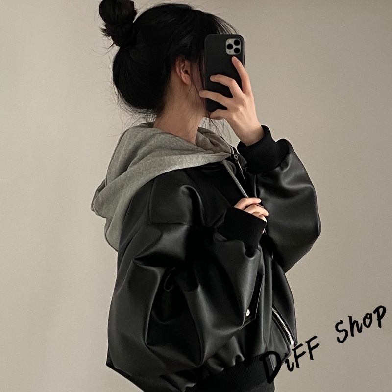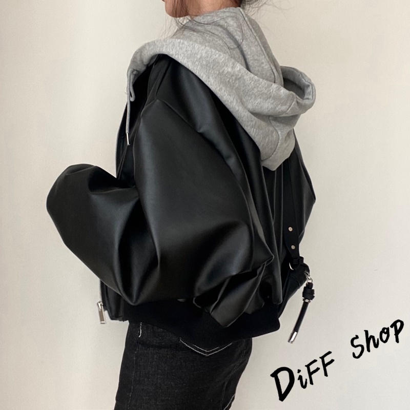 【DIFF】韓版小眾拉鍊寬鬆假兩件連帽皮衣外套 女裝 衣服 上衣 保暖外套 保暖上衣 連帽外套 冬天外套【J375】【J375】黑色JacketsDiFF shop