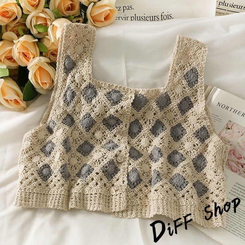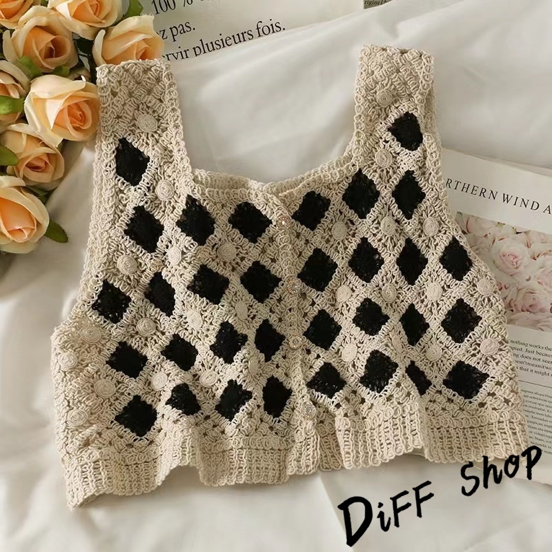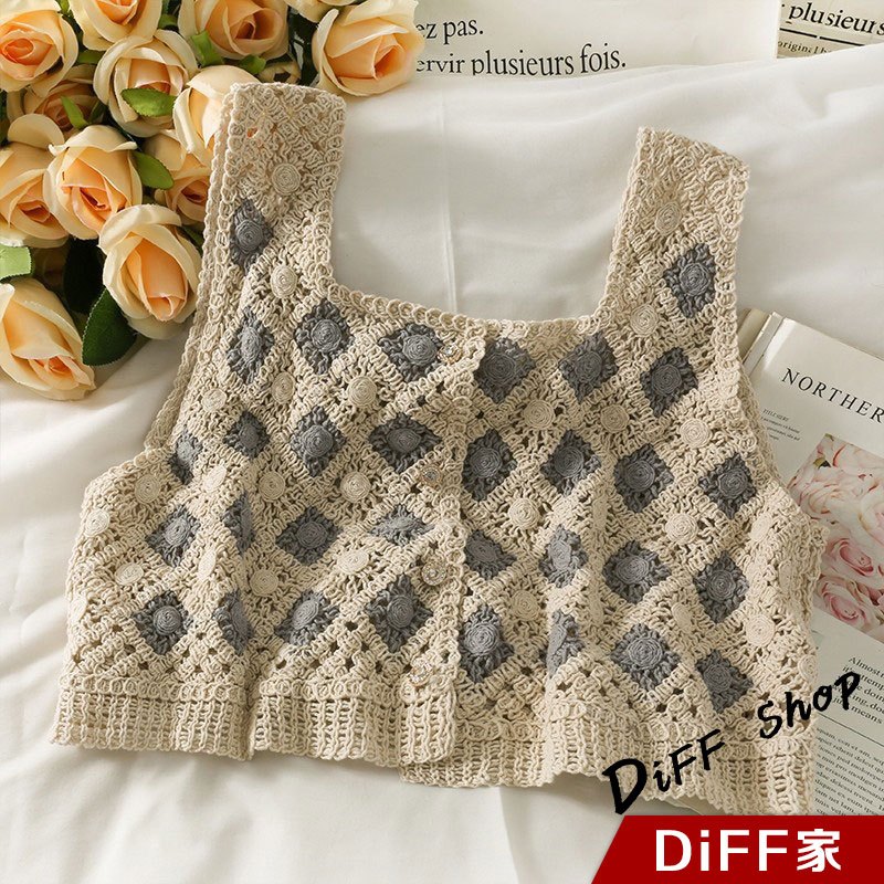 【DIFF】韓版法式菱格鉤花鏤空針織背心 小可愛 女裝 衣服 短版上衣 小背心 夏天女裝 吊帶 內搭【V386】【V386】白黑色|【V386】杏黑色Tanks & CamisolesDiFF shop