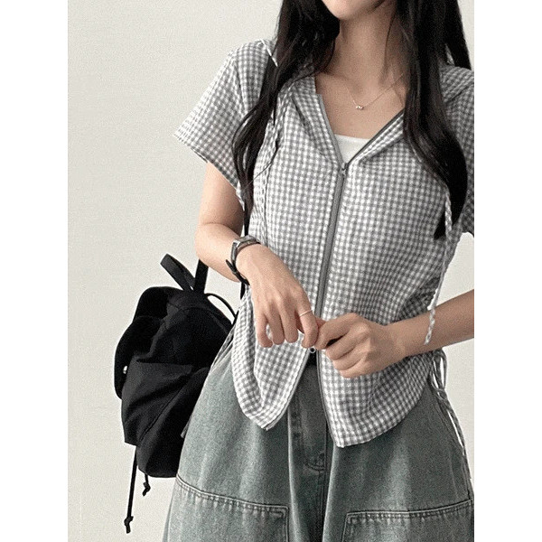 Codibook|韓國 HIJJOO 可調式兩穿格紋短袖連帽外套[預購]拉鍊外套 女裝灰色|黑色|粉紅色JacketsCodibook 韓國女裝購物平台