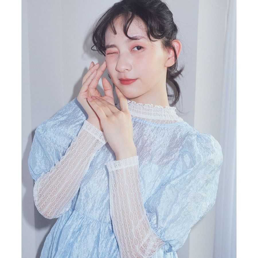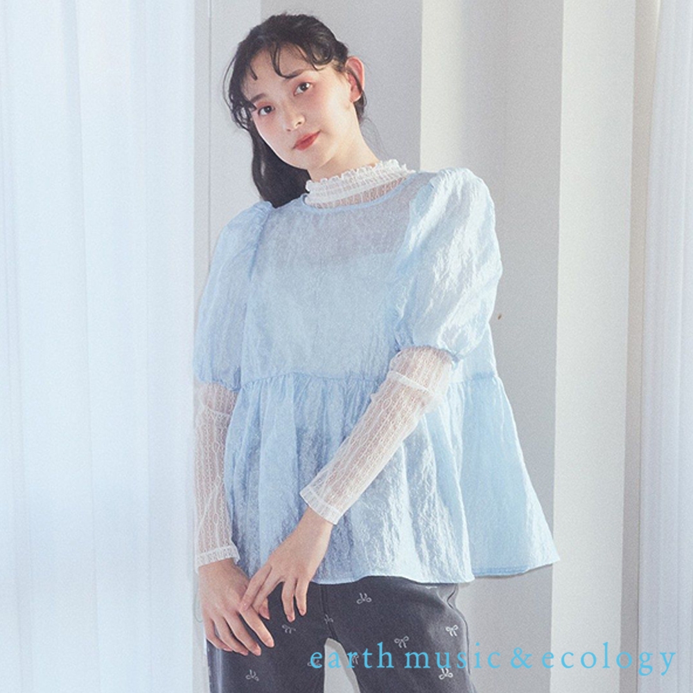 earth music&ecology 緹花透膚設計泡泡袖圓領上衣(01000112300)