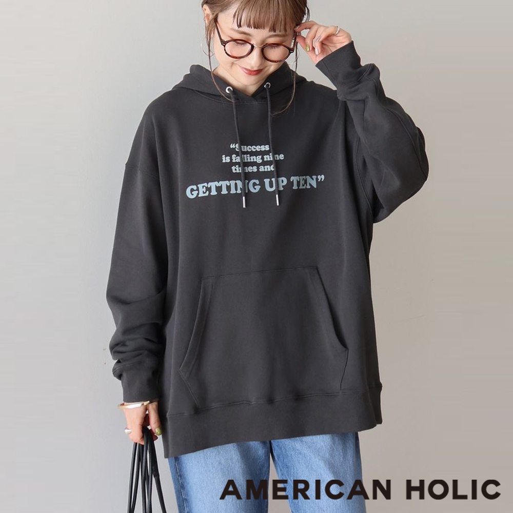 AMERICAN HOLIC 植絨徽標印花連帽口袋長版上衣(0H000026900)混灰色F|炭灰色F|深藍色FHoodiesearth music&ecology Select Store