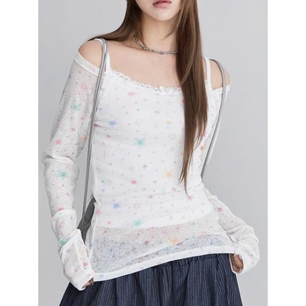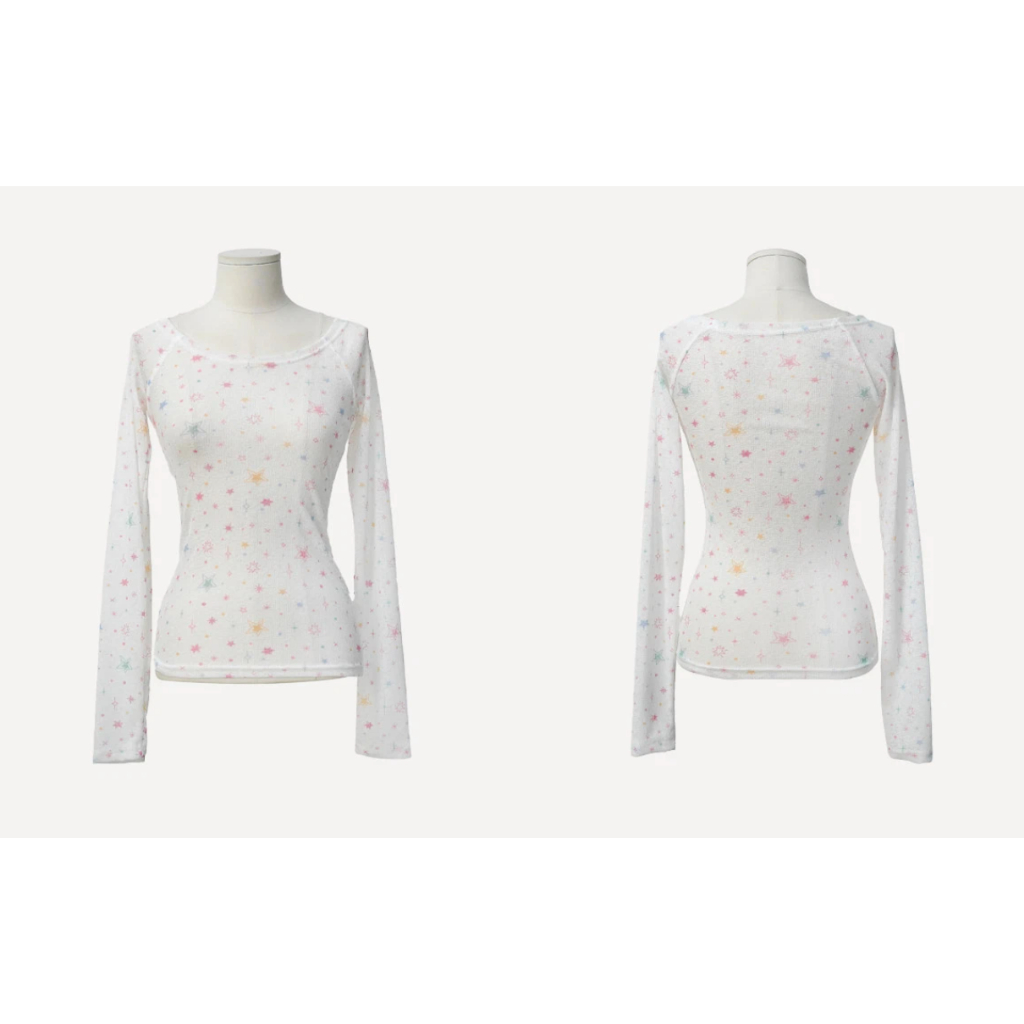 Codibook|韓國 binary01 彩色星星印花透膚長袖T恤[預購]長袖上衣 雪紡襯衫 女裝白色,FREET-shirtsCodibook 韓國女裝購物平台